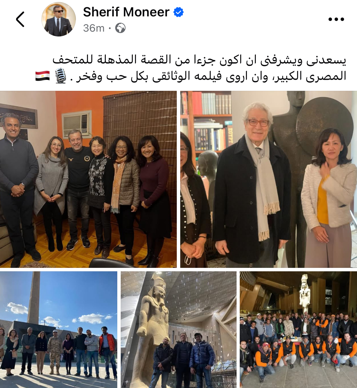 وكتب شريف منير على حسابه الشخصي بموقع فيسبوك: "يسعدني ويشرفني أن أكون جزءًا من القصة المذهلة للمتحف المصري الكبير، وأن أروي فيلمه الوثائقي بكل حب وفخر".