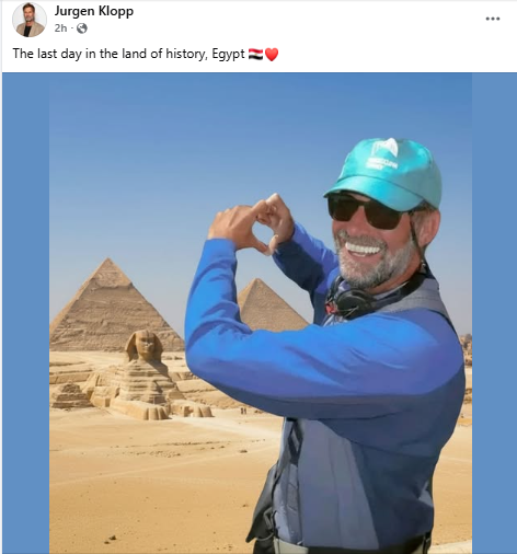 أثار المدرب الألماني يورجن كلوب، المدير الفني السابق لنادي ليفربول الإنجليزي، حالة من الجدل والتفاعل الواسع بين رواد مواقع التواصل الاجتماعي في مصر والعالم العربي، بعد نشره رسالة مؤثرة وصورة له من أمام أهرامات الجيزة، عبّر من خلالها عن إعجابه الشديد بالحضارة المصرية وتاريخها العريق.