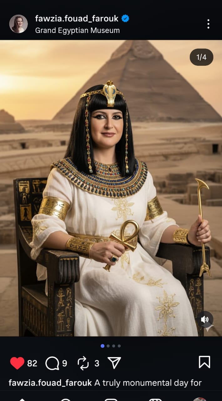 احتفلت الأميرة فوزية لطيفة فؤاد، ابنة الملك أحمد فؤاد الثاني وحفيدة الملك فاروق، بافتتاح المتحف المصري الكبير بطريقة فنية مبتكرة، إذ نشرت عبر حسابها الرسمي على منصة “إنستجرام” صورة لها بتقنية الذكاء الاصطناعي تجسّدها في هيئة ملكة فرعونية، تعبيرًا عن فخرها بالحضارة المصرية العريقة واعتزازها بالحدث العالمي.