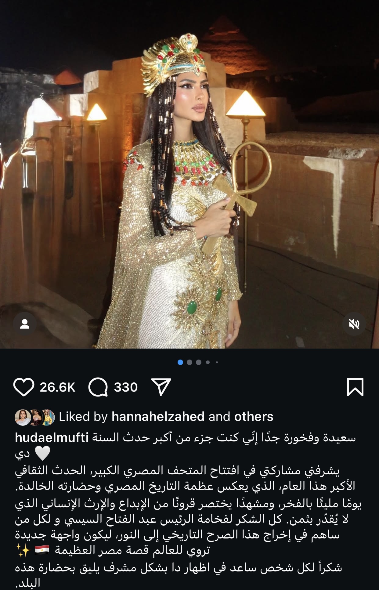 ونشرت هدى المفتي، عبر حسابها الرسمي على موقع “إنستجرام”، مجموعة صور من مشاركتها في الافتتاح، وعلّقت قائلة: “سعيدة وفخورة جدًا إنّي كنت جزء من أكبر حدث السنة. يشرفني مشاركتي في افتتاح المتحف المصري الكبير، الحدث الثقافي الأكبر هذا العام، الذي يعكس عظمة التاريخ المصري وحضارته الخالدة. يومًا مليئًا بالفخر، ومشهدًا يختصر قرونًا من الإبداع والإرث الإنساني الذي لا يُقدّر بثمن”.