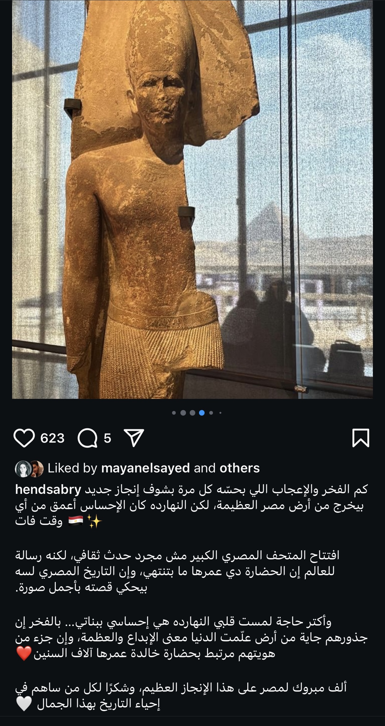 ونشرت هند صبري، عبر حسابها الرسمي على موقع التواصل الاجتماعي “إنستجرام” منشورًا قالت فيه: “كم الفخر والإعجاب اللي بحسّه كل مرة بشوف إنجاز جديد بيخرج من أرض مصر العظيمة، لكن النهارده كان الإحساس أعمق من أي وقت فات، افتتاح المتحف المصري الكبير مش مجرد حدث ثقافي، لكنه رسالة للعالم إن الحضارة دي عمرها ما بتنتهي، وإن التاريخ المصري لسه بيحكي قصته بأجمل صورة”.