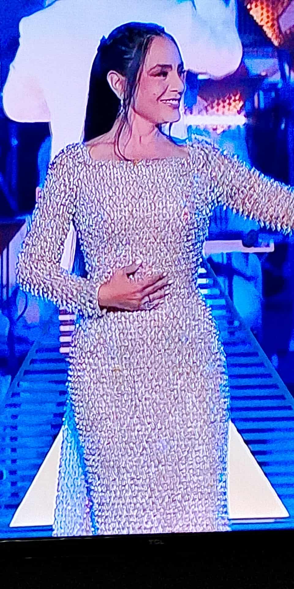 وارتدت الفنانة شريهان فستان طويل فضي فاتح ذو لامعة قوية ويشبه في تصميمه قشر السمك.