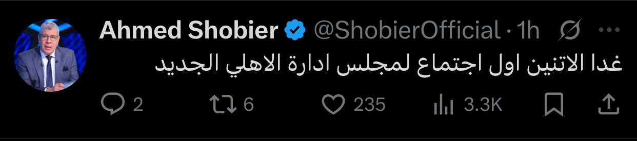 وكتب شوبير عبر حسابه الشخصي بموقع إكس: "غدًا الاتنين أول اجتماع لمجلس إدارة الأهلي الجديد".