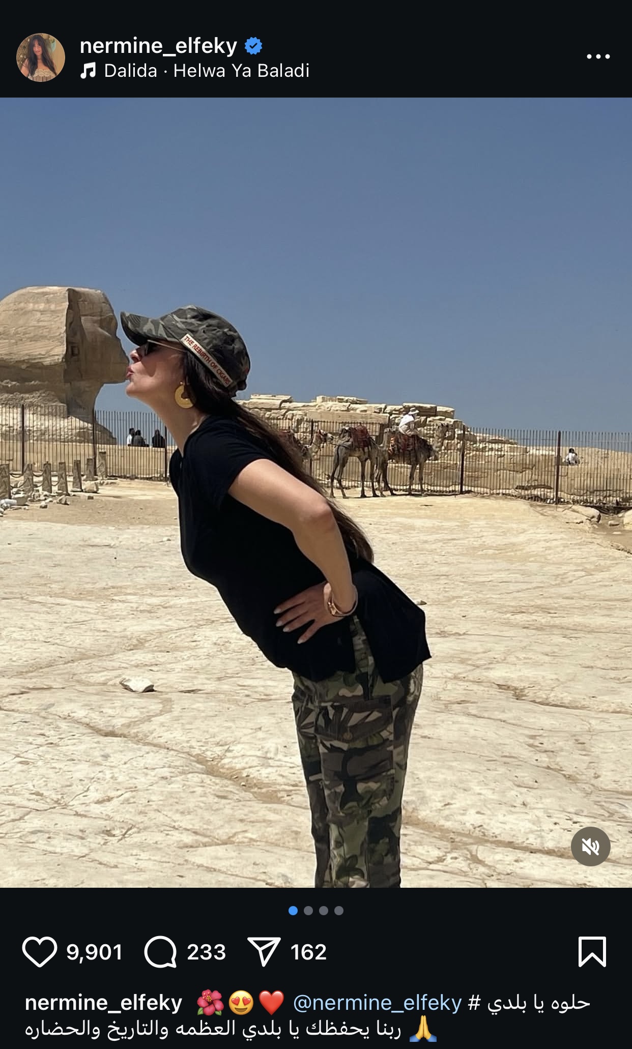وعلقت نرمين الفقي على الصور: "حلوة بلدي، ربنا يحفظك يا بلدي، العظمة والتاريخ والحضارة ".