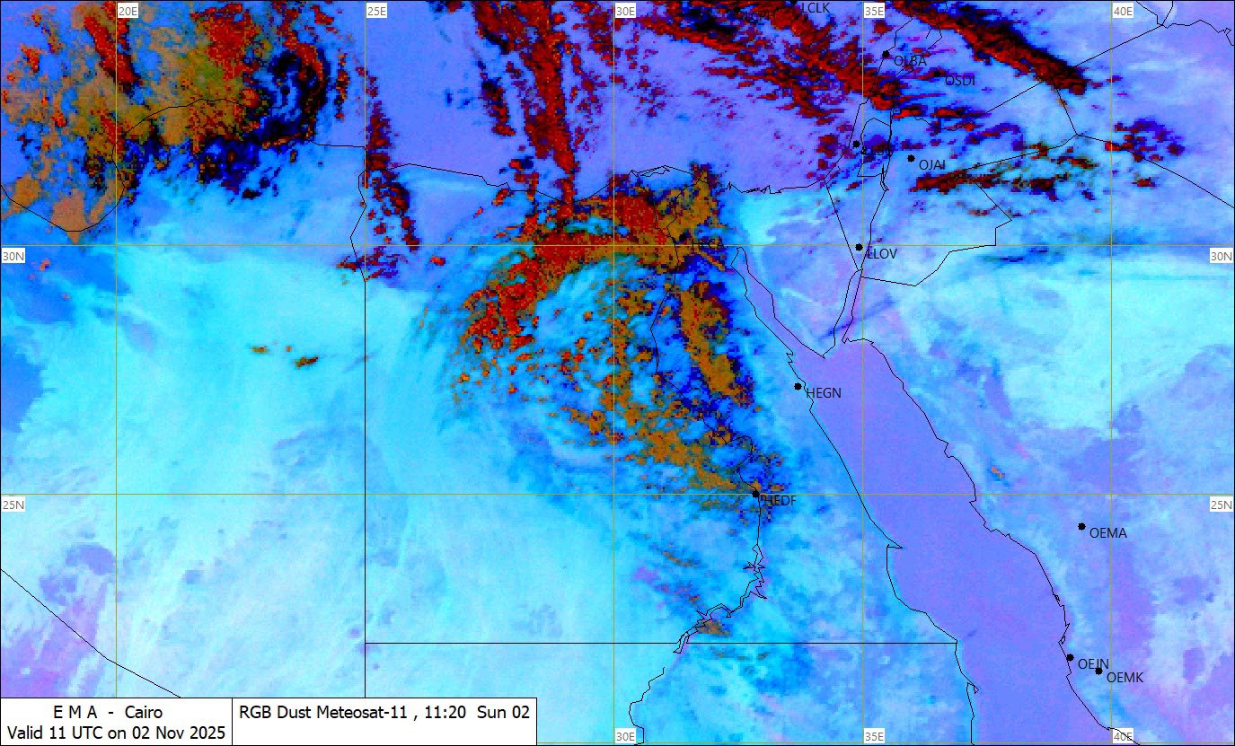 بحسب هيئة الأرصاد الجوية، فإن السحب المنخفضة والمتوسطة تظهر على مناطق من الصحراء الغربية صاحبها فرص أمطار متوسطة ورعدية أحياناً.