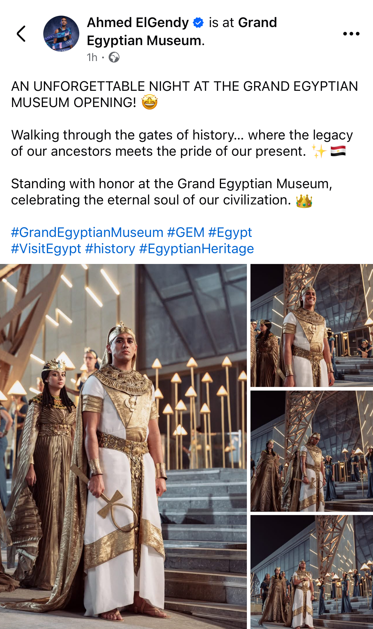 ونشر الجندي عبر حسابه الرسمي بموقع فيسبوك منشورًا قال فيه: “ليلة لا تُنسى في افتتاح المتحف المصري الكبير! نسير عبر بوابات التاريخ… حيث يلتقي إرث أسلافنا بفخر حاضرنا، نقف بفخر في المتحف المصري الكبير، نحتفل بروح حضارتنا الخالدة".