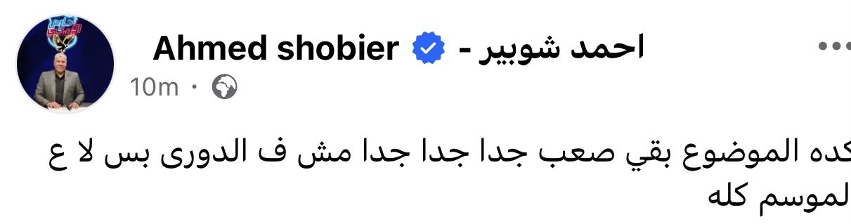وكتب شوبير ، عبر حسابه الشخصي بموقع فيسبوك: "كدة الموضوع بقى صعب جدًا مش في الدوري بس لا على الموسم كله".