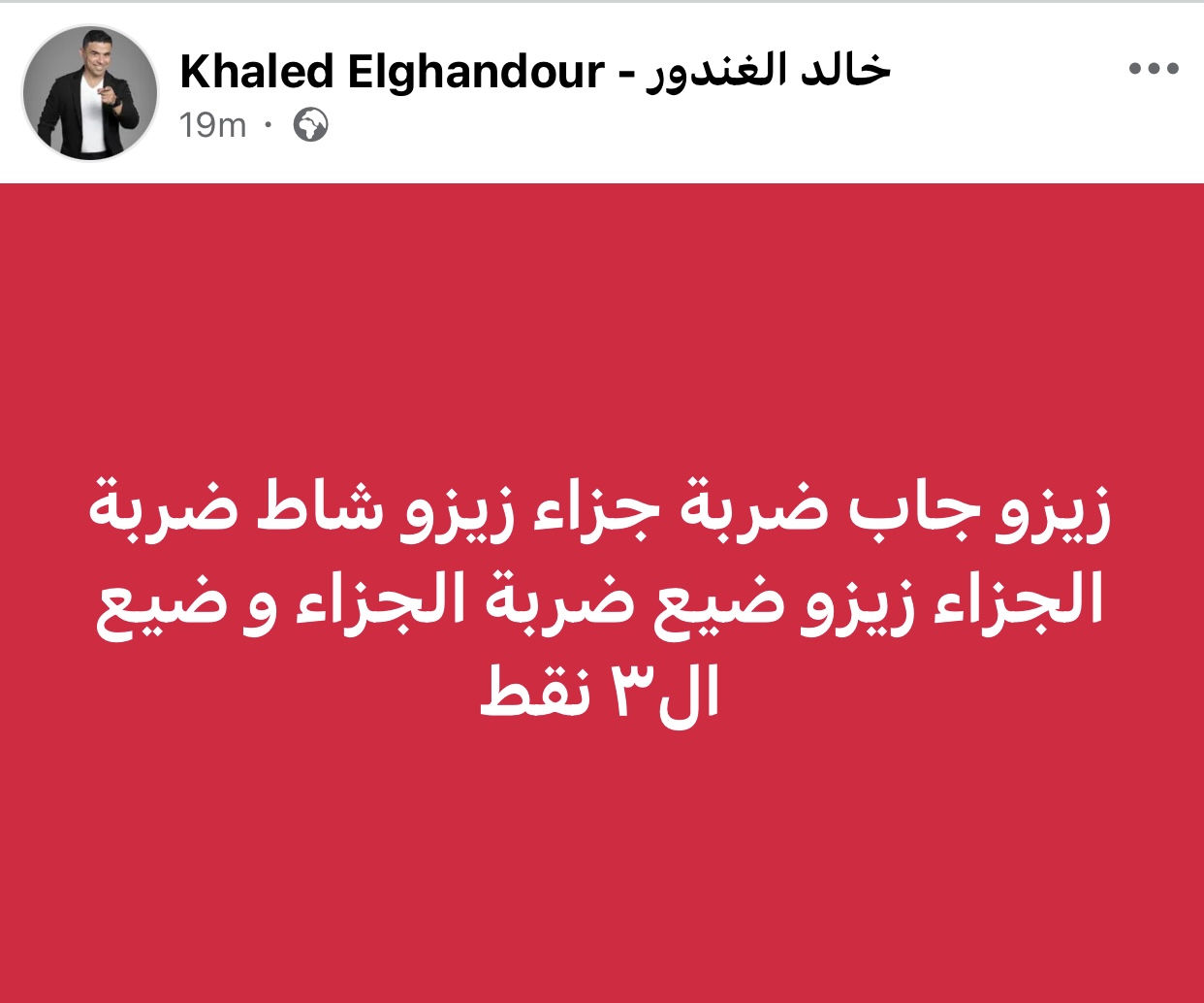 وكتب الغندور عبر حسابه الشخصي بموقع فيسبوك: "زيزو جاب ضربة جزاء زيزو شاط ضربة الجزاء زيزو ضيع ضربة الجزاء وضيع ال٣ نقط".