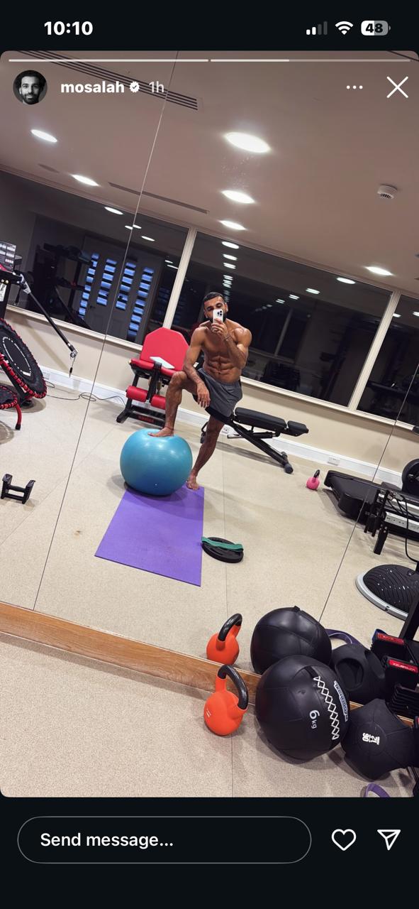 وظهر محمد صلاح في الصورة من داخل صالة الألعاب الرياضية أثناء ميرانه اليومي، كما أبرز رشاقته من خلالها.