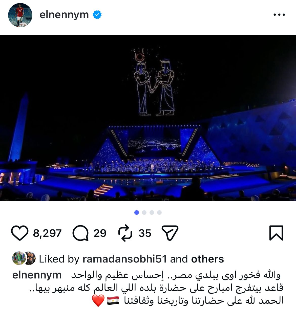 وكتب النني عبر حسابه على انستجرام: “والله فخور ببلدي مصر إحساس عظيم والواحد قاعد بيتفرج على حضارة بلده اللي العالم كله منبهر بيها الحمد لله على حضارتنا وتاريخنا وثقافتنا”.