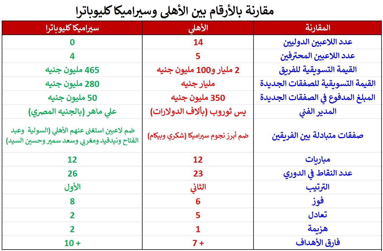 وكتب خالد طلعت عبر صفحته على موقع التواصل الاجتماعي فيسبوك:"مقارنة بالأرقام بين الأهلي وسيراميكا كليوباترا".