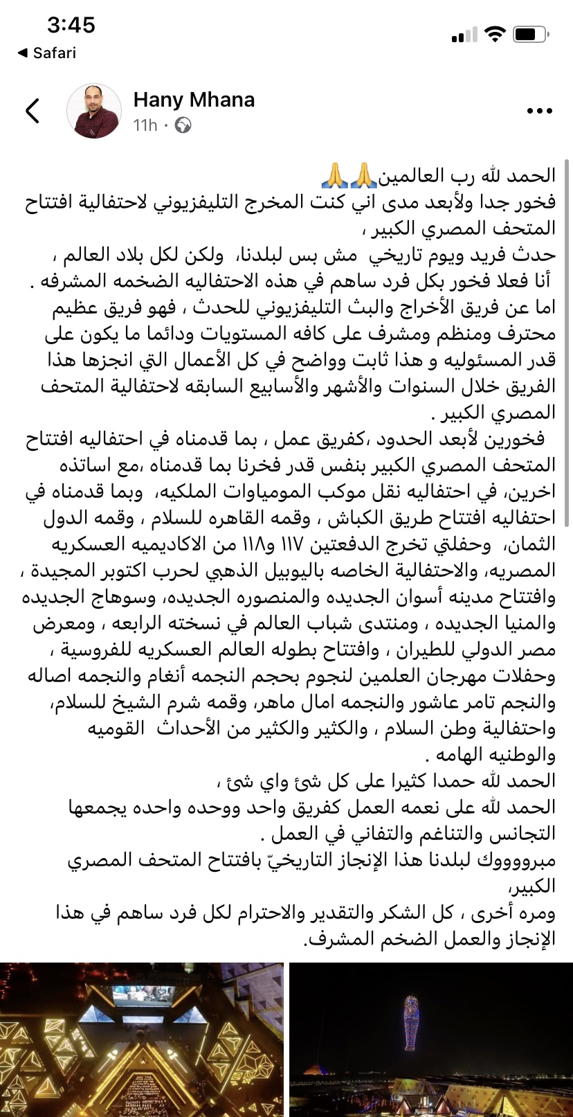وأكمل :"فخورون لأبعد الحدود، كفريق عمل، بما قدمناه في احتفالية افتتاح المتحف المصري الكبير، بنفس فخرنا باحتفالية موكب المومياوات الملكية، وافتتاح طريق الكباش، وقمة القاهرة للسلام، واليوبيل الذهبي لنصر أكتوبر، وافتتاح مدن جديدة، ومنتدى شباب العالم، ومعرض مصر الدولي للطيران، والعديد من الاحتفاليات الوطنية الهامة".