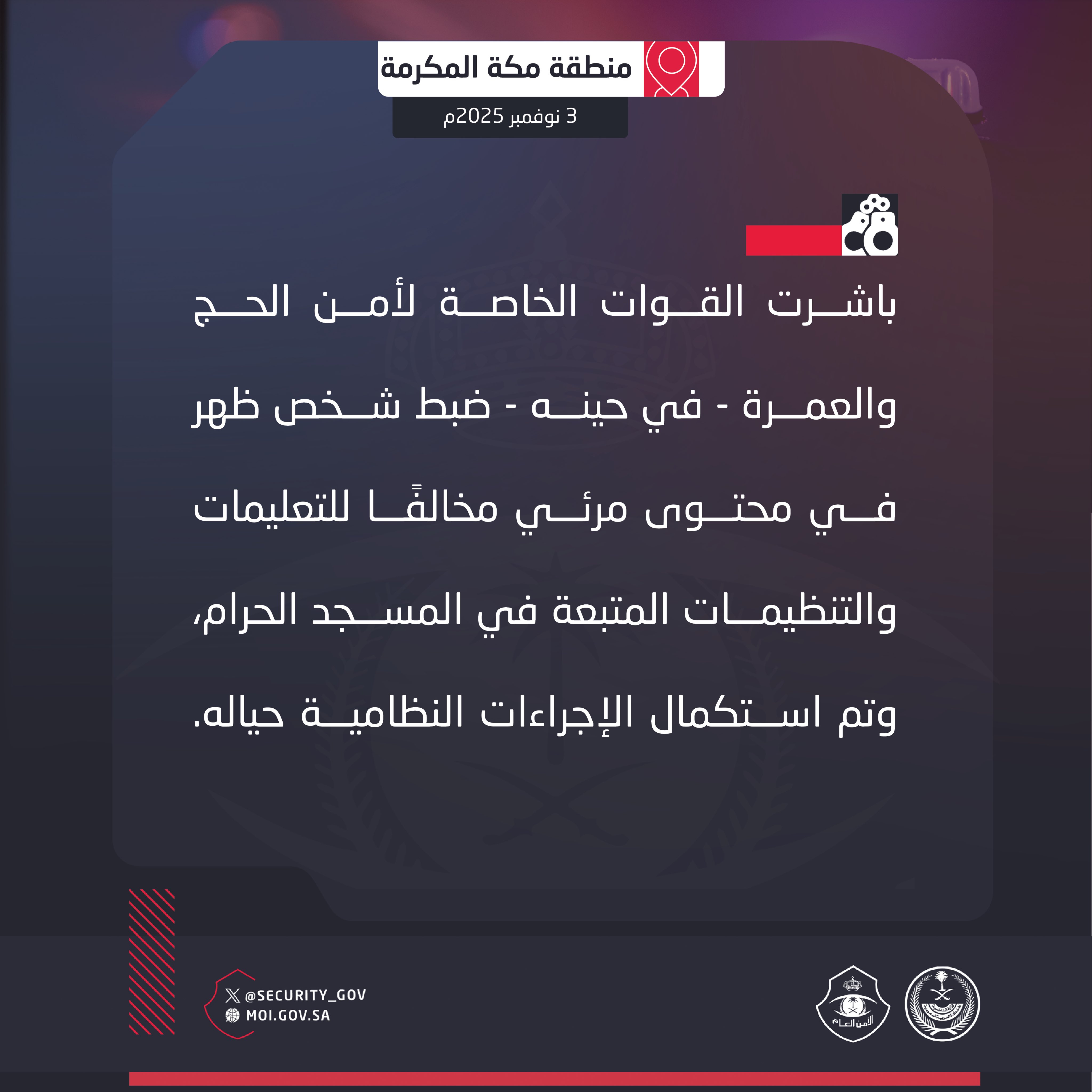 وقال الأمن العام السعودي في بيان نشرهع عبر حسابه الرسمي بمنصة إكس: القوات الخاصة لأمن الحج والعمرة تباشر – في حينه – ضبط شخص ظهر في محتوى مرئي مخالفًا للتعليمات والتنظيمات المتبعة في المسجد الحرام، وتم استكمال الإجراءات النظامية حياله.