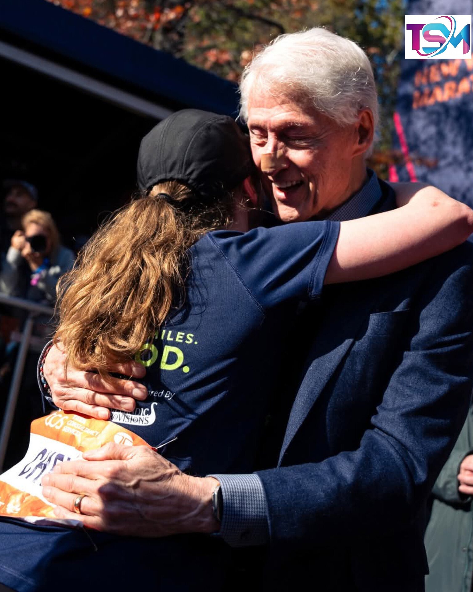 وشوهد الرئيس السابق، البالغ من العمر 79 عامًا، الذي عانى من أزمة صحية العام الماضي أدخلته المستشفى بسبب ارتفاع درجة حرارته واشتباه إصابته بالجفاف، وقد لف ضمادة حول طرف أنفه أثناء معانقته تشيلسي، البالغة من العمر 45 عامًا، والتي شاركت في عدة ماراثونات في السنوات الأخيرة.