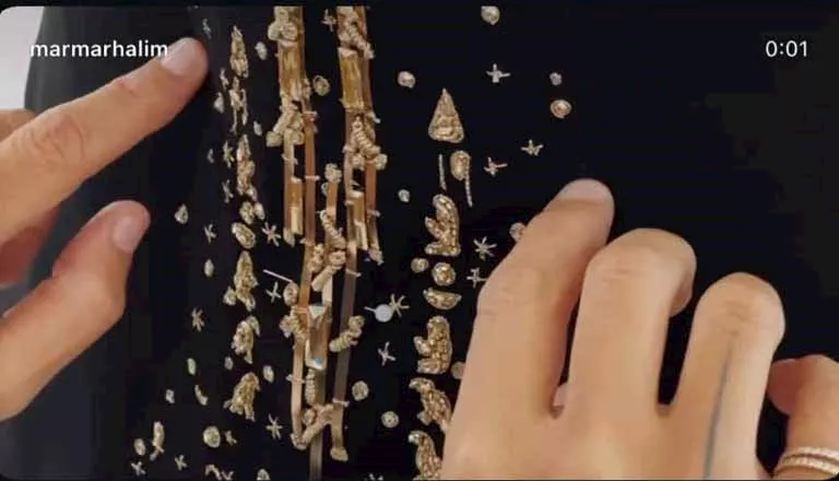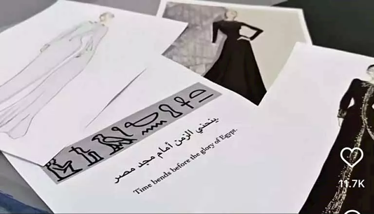 الفستان الذي حمل توقيع مصممة الأزياء المصرية مرمر حليم جاء بتصميم ملكي آسر، يجمع بين رمزية الماضي وسحر الحاضر، فقد نُقشت العبارة الخالدة بالتطريز اليدوي باللغة الهيروغليفية، لتُعيد للأذهان روح مصر القديمة التي صنعت المجد وخلّدت اسمها على جدران التاريخ.