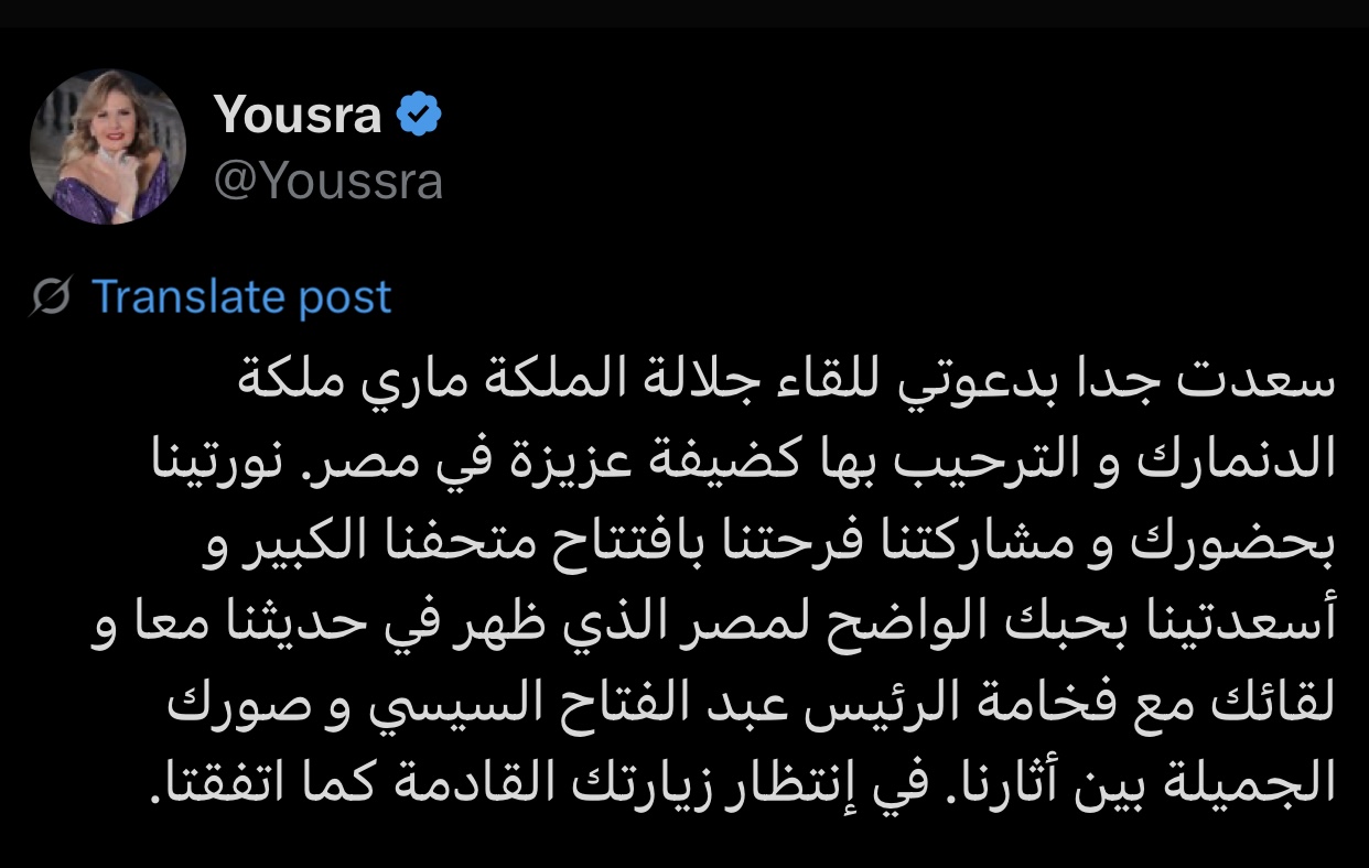 ونشرت يسرا عبر حسابها الشخصي على موقع التواصل الاجتماعي إكس “تويتر سابقًا” منشورًا قالت فيه: “سعدت جدًا بدعوتي للقاء جلالة الملكة ماري ملكة الدنمارك والترحيب بها كضيفة عزيزة في مصر. نورتينا بحضورك ومشاركتنا فرحتنا بافتتاح متحفنا الكبير وأسعدتينا بحبك الواضح لمصر الذي ظهر في حديثنا معًا ولقائك مع فخامة الرئيس عبد الفتاح السيسي وصورك الجميلة بين آثارنا. في انتظار زيارتك القادمة كما اتفقنا".