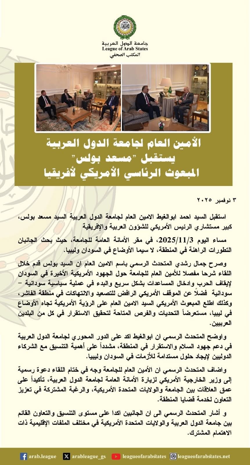 استقبل أحمد أبو الغيط الأمين العام لجامعة الدول العربية، مسعد بويلس، كبير مستشاري الرئيس الأمريكي للشؤون العربية والأفريقية، مساء الإثنين 3 /11 /2025 بمقر الأمانة العامة للجامعة، وبحث الجانبان التطورات الراهنة في المنطقة، ولا سيما الأوضاع في السودان وليبيا.