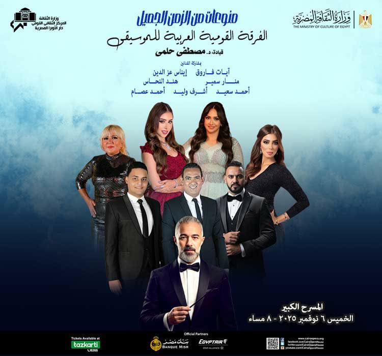 مجموعة مختارة من طربيات عمالقة زمن الفن الجميل تأتى ضمن خطط وزارة الثقافة لإعادة إحياء التراث، وتقدمها دار الأوبرا المصرية، برئاسة الدكتور علاء عبد السلام، خلال حفل الفرقة القومية العربية للموسيقى، المقام بقيادة المايسترو الدكتور مصطفى حلمى فى الثامنة مساء الخميس 6 نوفمبر على المسرح الكبير.
