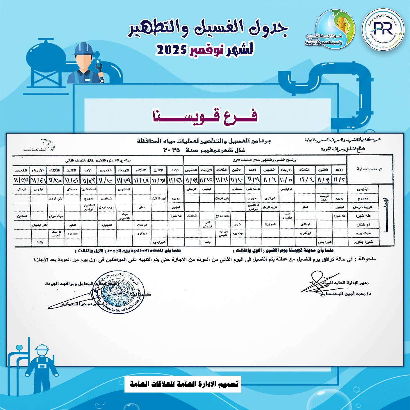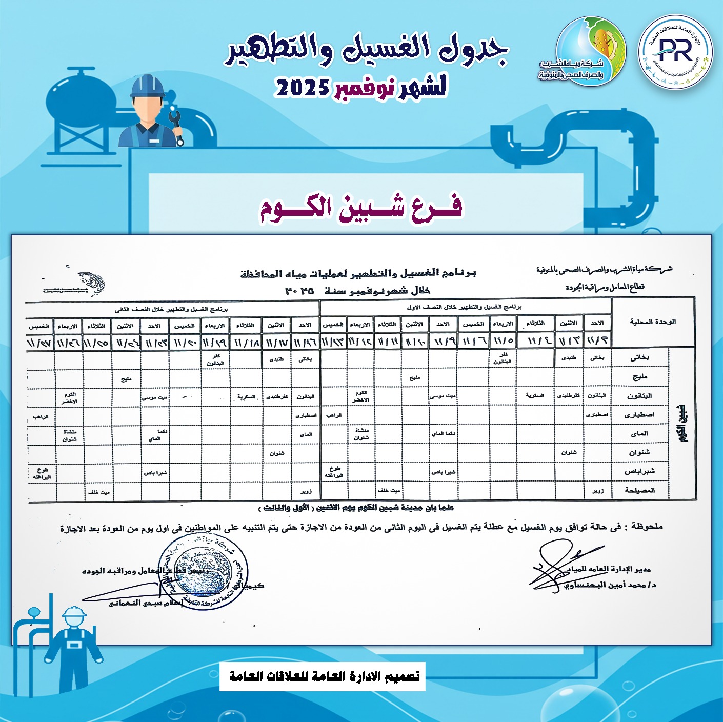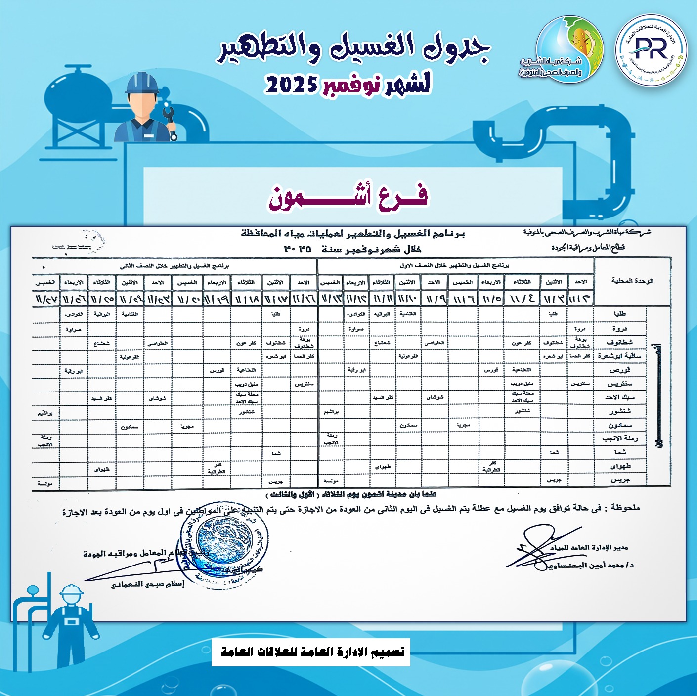 أعلن المهندس رشدي السيد عمر ، رئيس شركة مياه الشرب والصرف الصحى بالمنوفية، خطة غسيل شبكات المياه بكافة مناطق المحافظة خلال شهر نوفمبر 2025م وفقًا للمناطق المحددة بجدول الغسيل الدورى للشبكات .