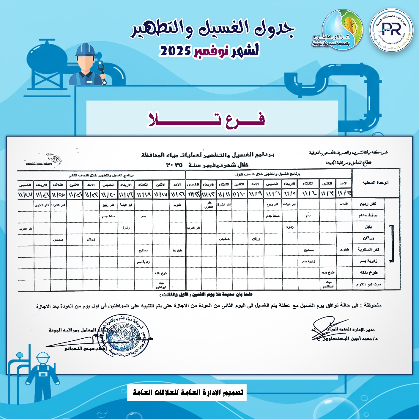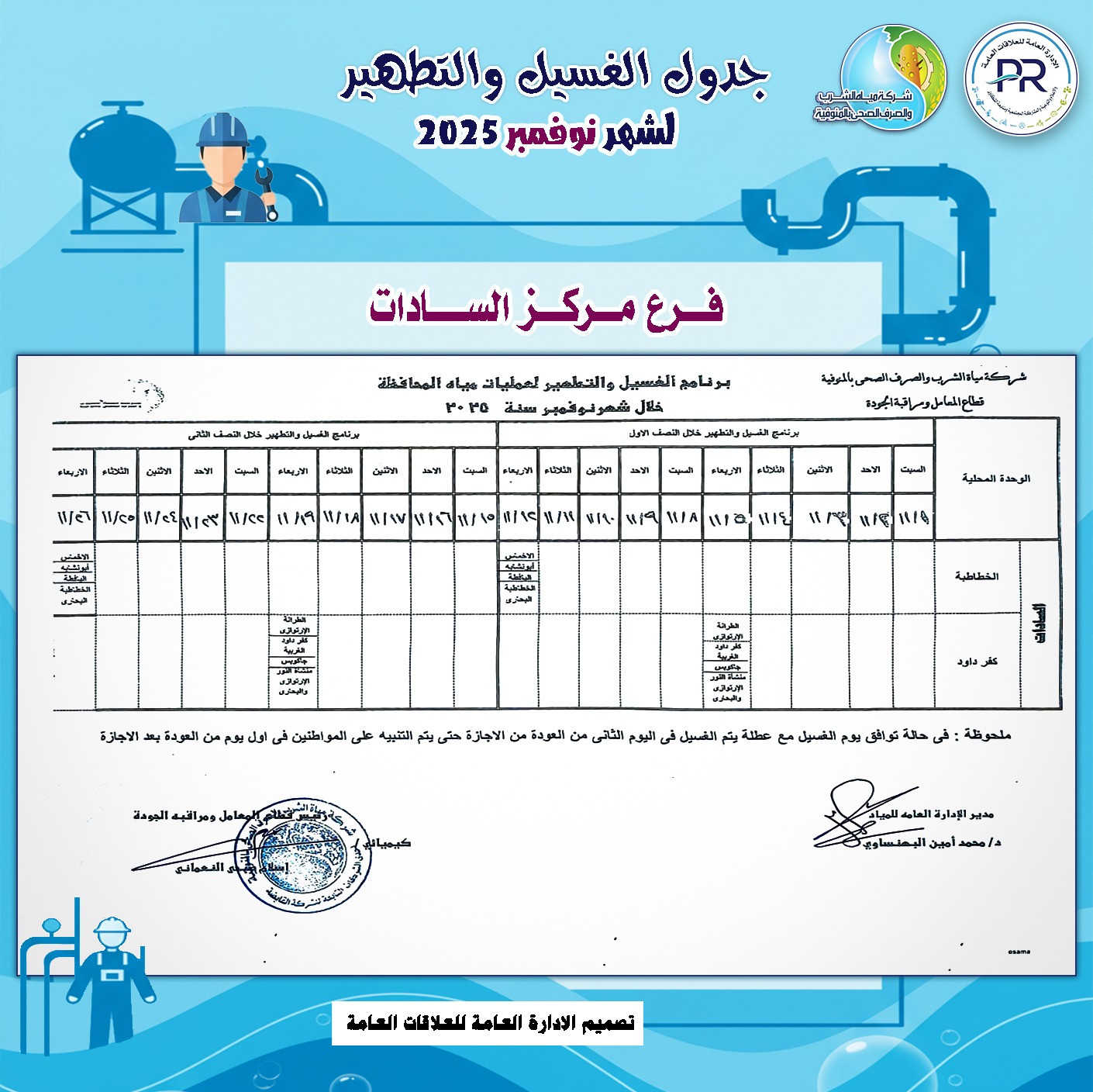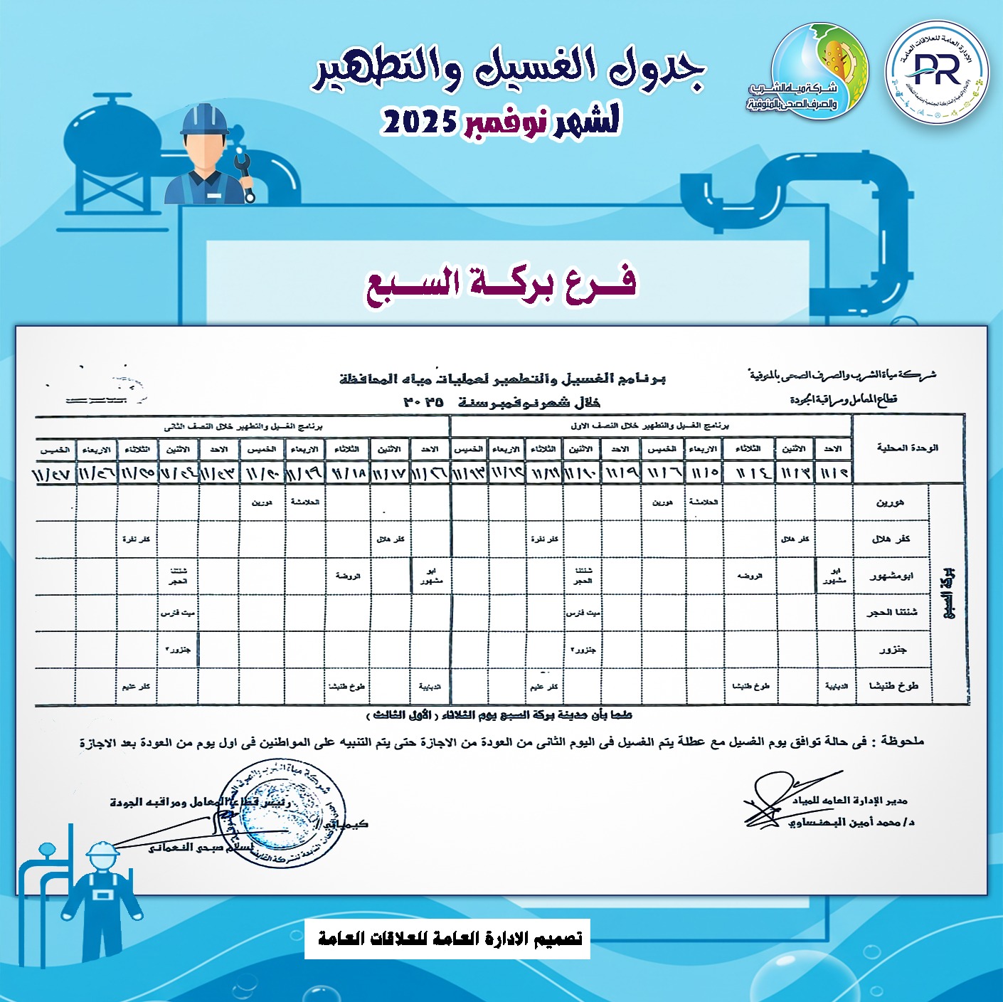 أعلن المهندس رشدي السيد عمر ، رئيس شركة مياه الشرب والصرف الصحى بالمنوفية، خطة غسيل شبكات المياه بكافة مناطق المحافظة خلال شهر نوفمبر 2025م وفقًا للمناطق المحددة بجدول الغسيل الدورى للشبكات .