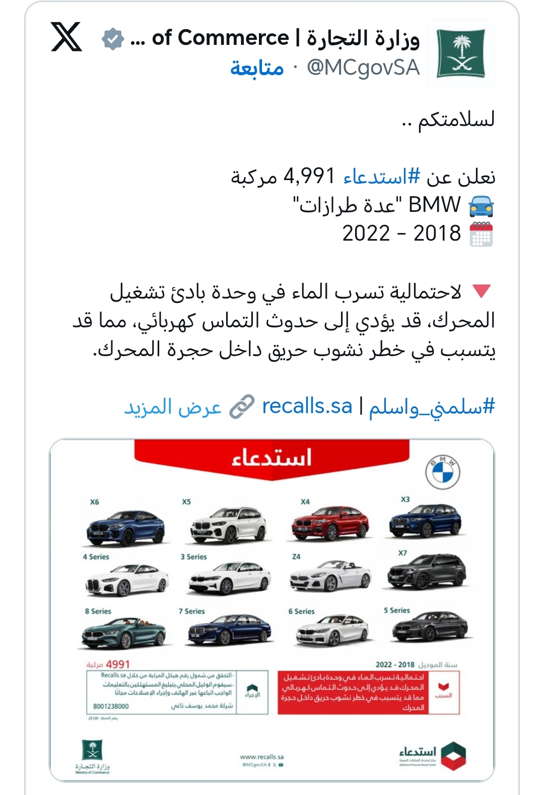 وفي بيان آخر، أعلنت وزارة التجارة عن استدعاء 4,991 مركبة من شركة بي إم دبليو من عدة طرازات ما بين أعوام 2018 إلى 2022، بسبب احتمالية تسرب الماء إلى وحدة بادئ تشغيل المحرك (Starter Motor).