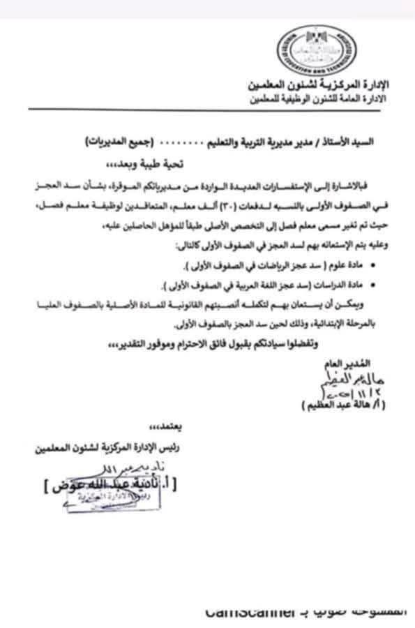 وأوضحت وزارة التربية والتعليم والتعليم الفني، أنه يمكن أن يستعان بهم لتكملة أنصبتهم القانونية للمادة الأصلية بالصفوف العليا بالمرحلة الابتدائية، وذلك لحين سد العجز بالصفوف الأولى.