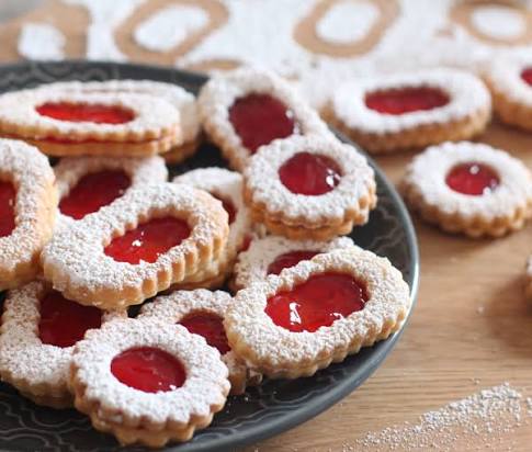ـ التزيين والتقديم: بعد أن يبرد تمامًا، تُلصق كل قطعتين بالمربى وتُزين بالشوكولاتة أو المكسرات حسب الرغبة.