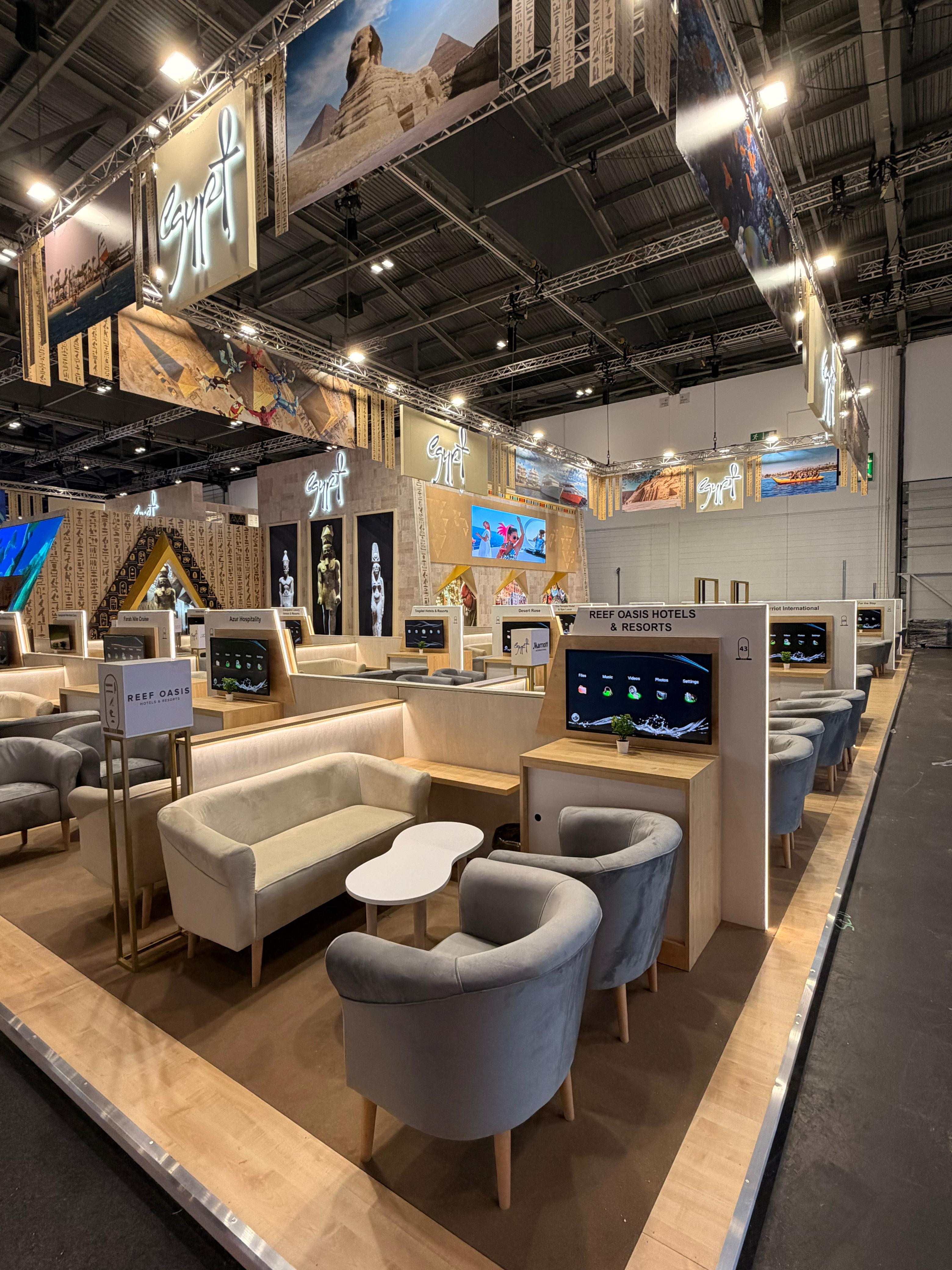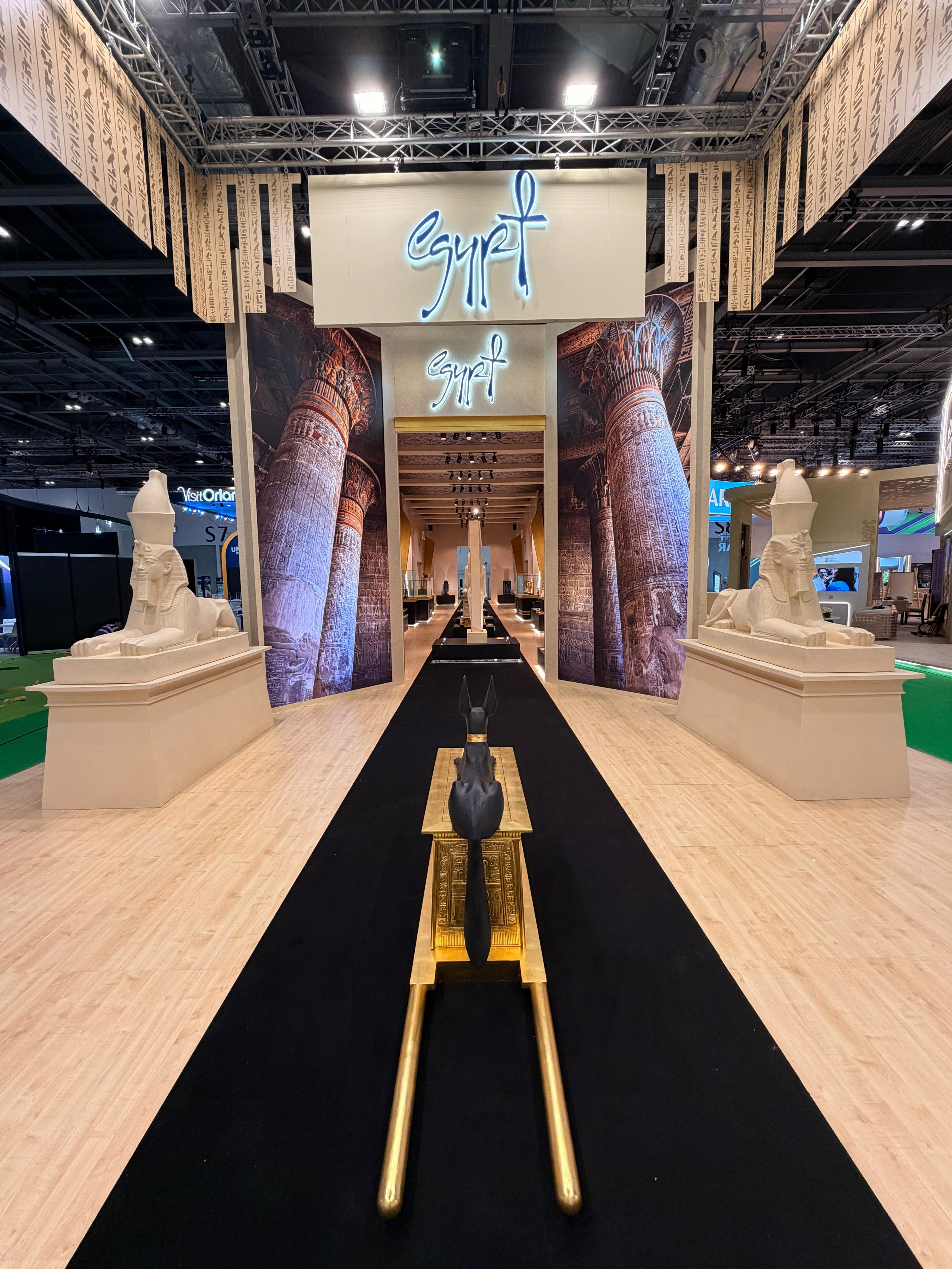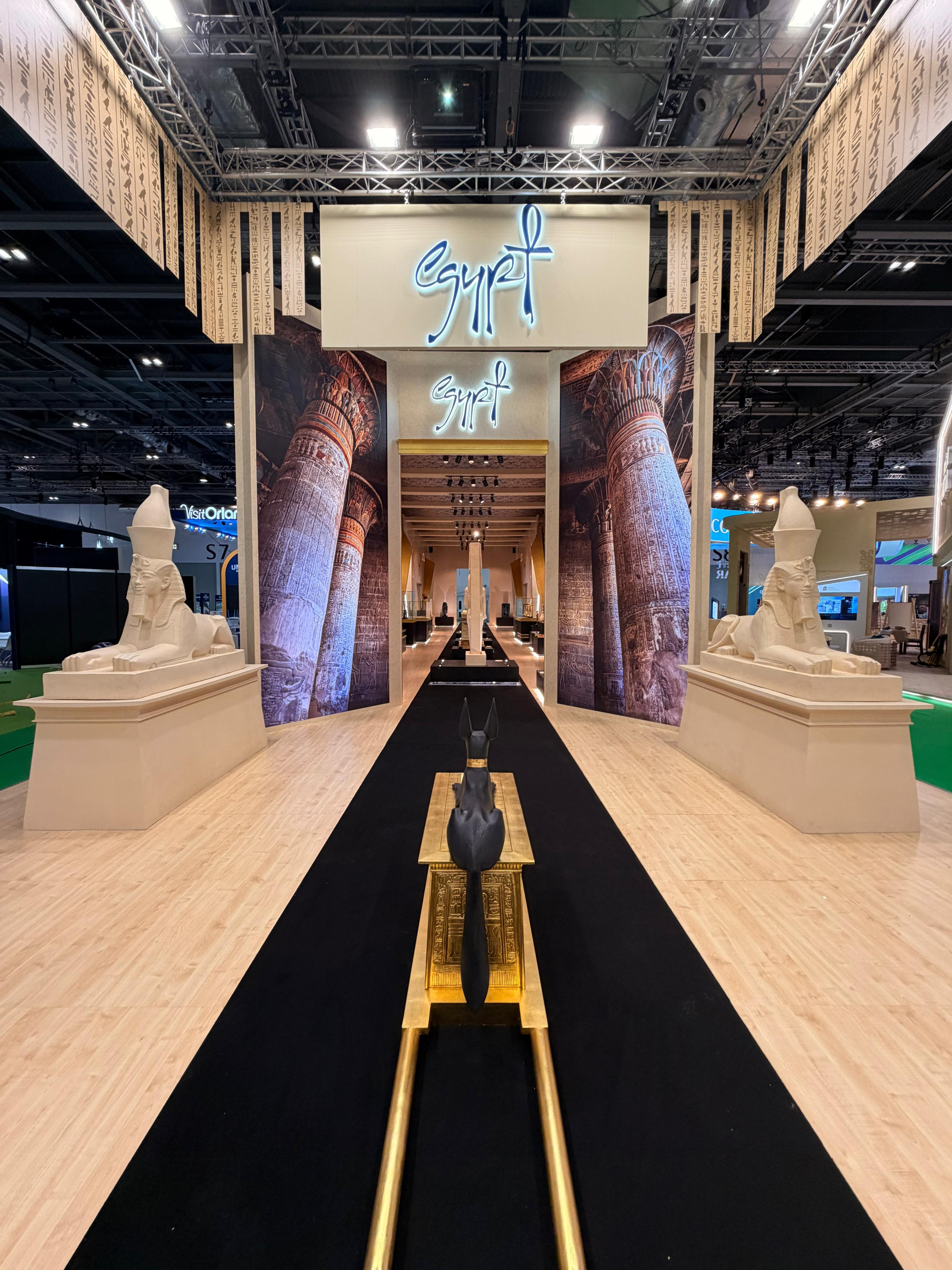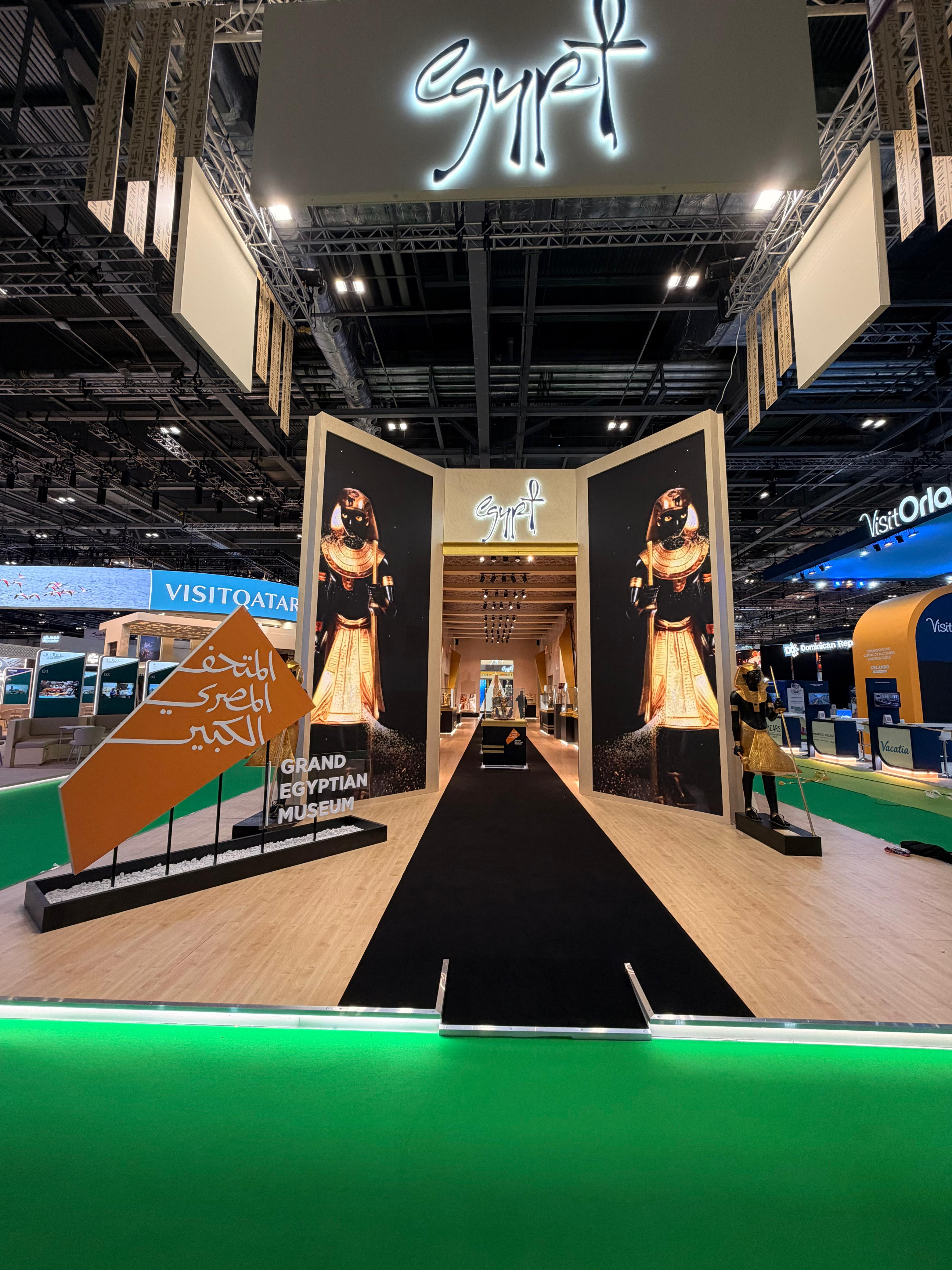 وينقسم الجناح إلى مساحتين رئيسيتين؛ الجزء الأول يمتد على مساحة 400 متر مربع ويضم نموذجًا مصغرًا لإحدى قاعات الملك توت عنخ آمون بالمتحف المصري الكبير احتفالاً بافتتاح المتحف، ليضم 54 مستنسخ أثري لمقتنيات الملك الذهبي أيقونة المتحف وفي نهايته شاشات على شكل هرمي لعرض الأفلام الترويجية عن المقصد السياحي المصري وما يتمتع به من منتجات سياحية متنوعة ومختلفة.