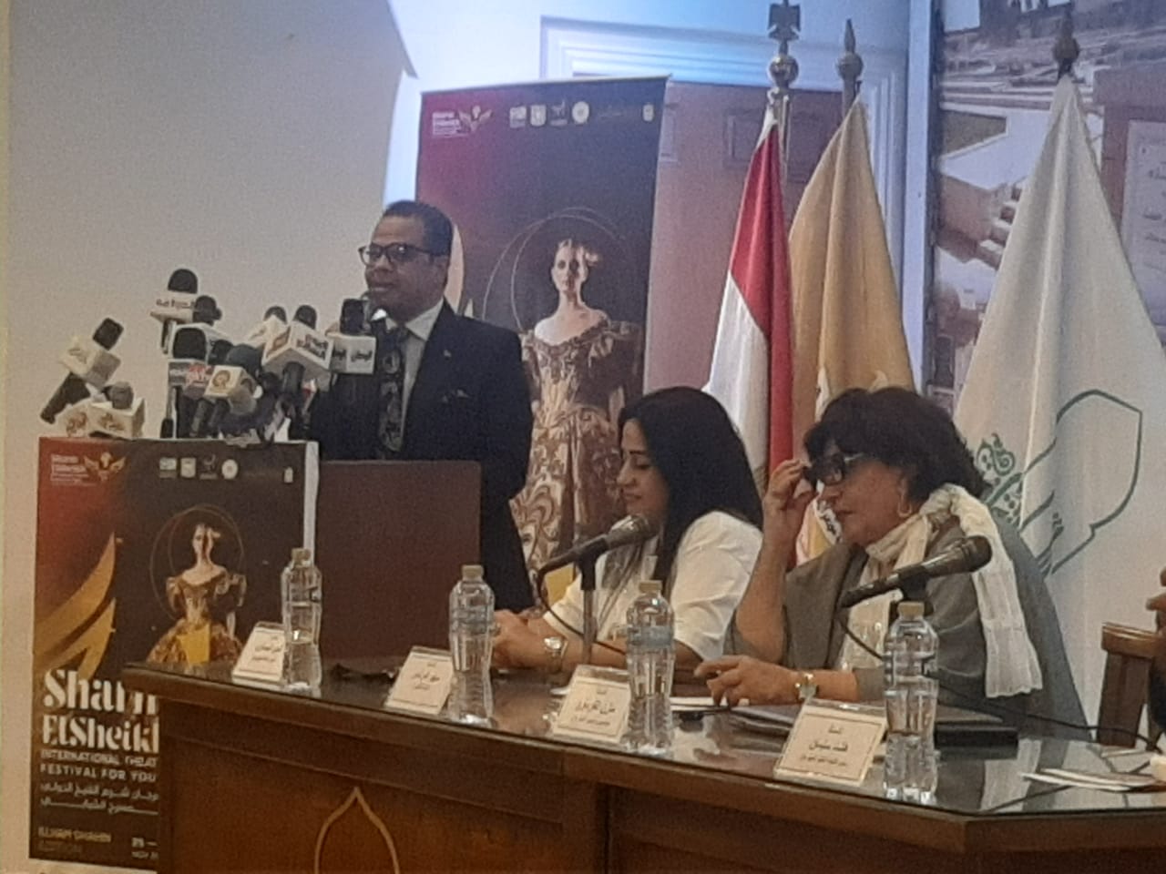 حرص الفنان طارق الابياري مقدم المؤتمر الصحفي للاعلان تفاصيل الدورة العاشرة من مؤتمر شرم الشيخ للمسرح الشبابي، ارسال تحية الي روح الفنانة الراحلة سميحة أيوب.