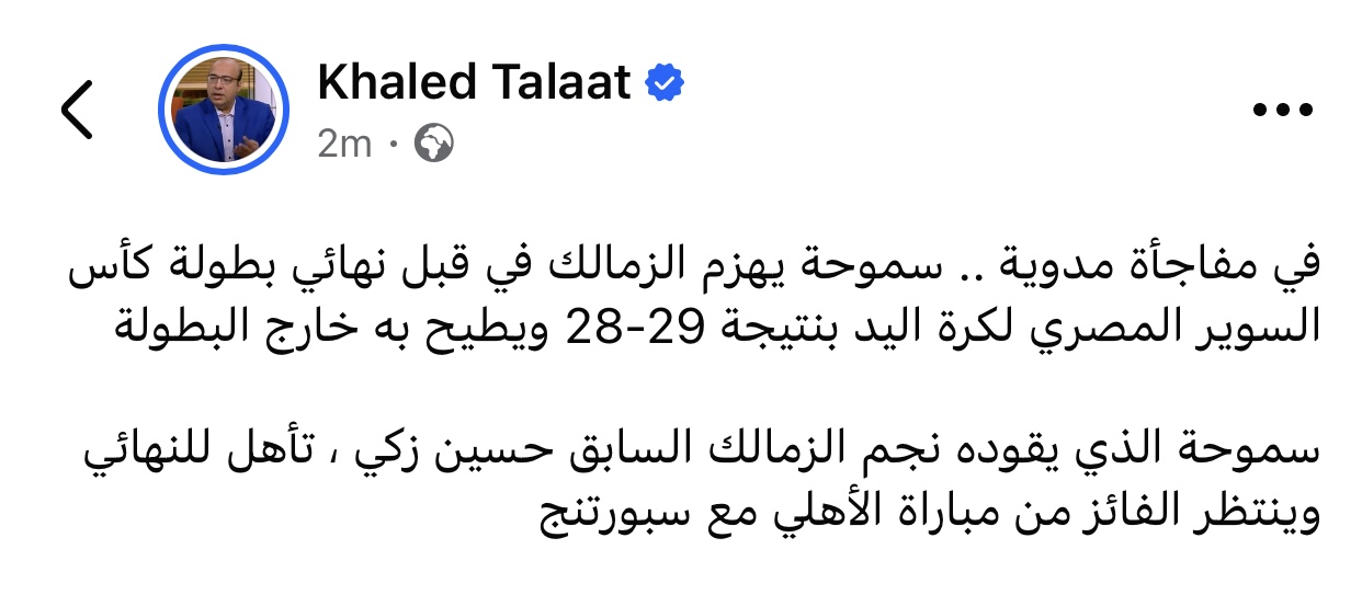 وكتب خالد طلعت في منشوره: “في مفاجأة مدوية .. سموحة يهزم الزمالك في قبل نهائي بطولة كأس السوبر المصري لكرة اليد بنتيجة 29-28 ويطيح به خارج البطولة".