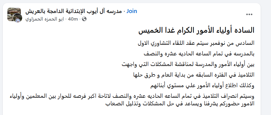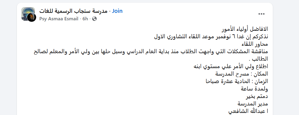 ومن جانبها حرصت الصفحات الرسمية للمدارس على فيس بوك ، على التأكيد على دعوة اولياء الأمور لحضور اللقاء التشاوري الأول اليوم الخميس ، لمناقشة و حل مشاكل الطلاب في الدراسة .