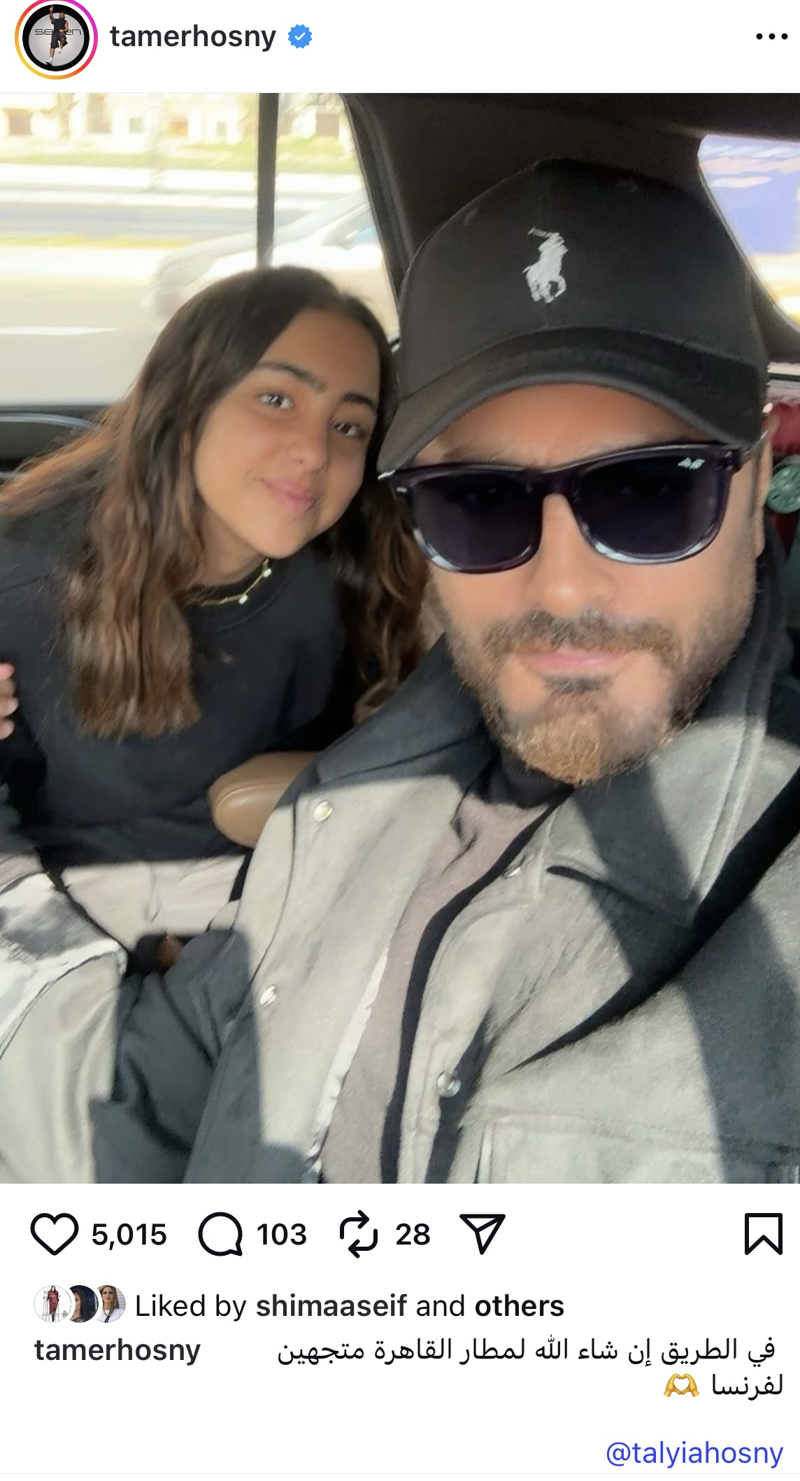 ونشر تامر حسني صورة برفقة ابنته تاليا من السيارة وعلق كاتبا :في الطريق إن شاء الله لمطار القاهرة رايحين لفرنسا.
