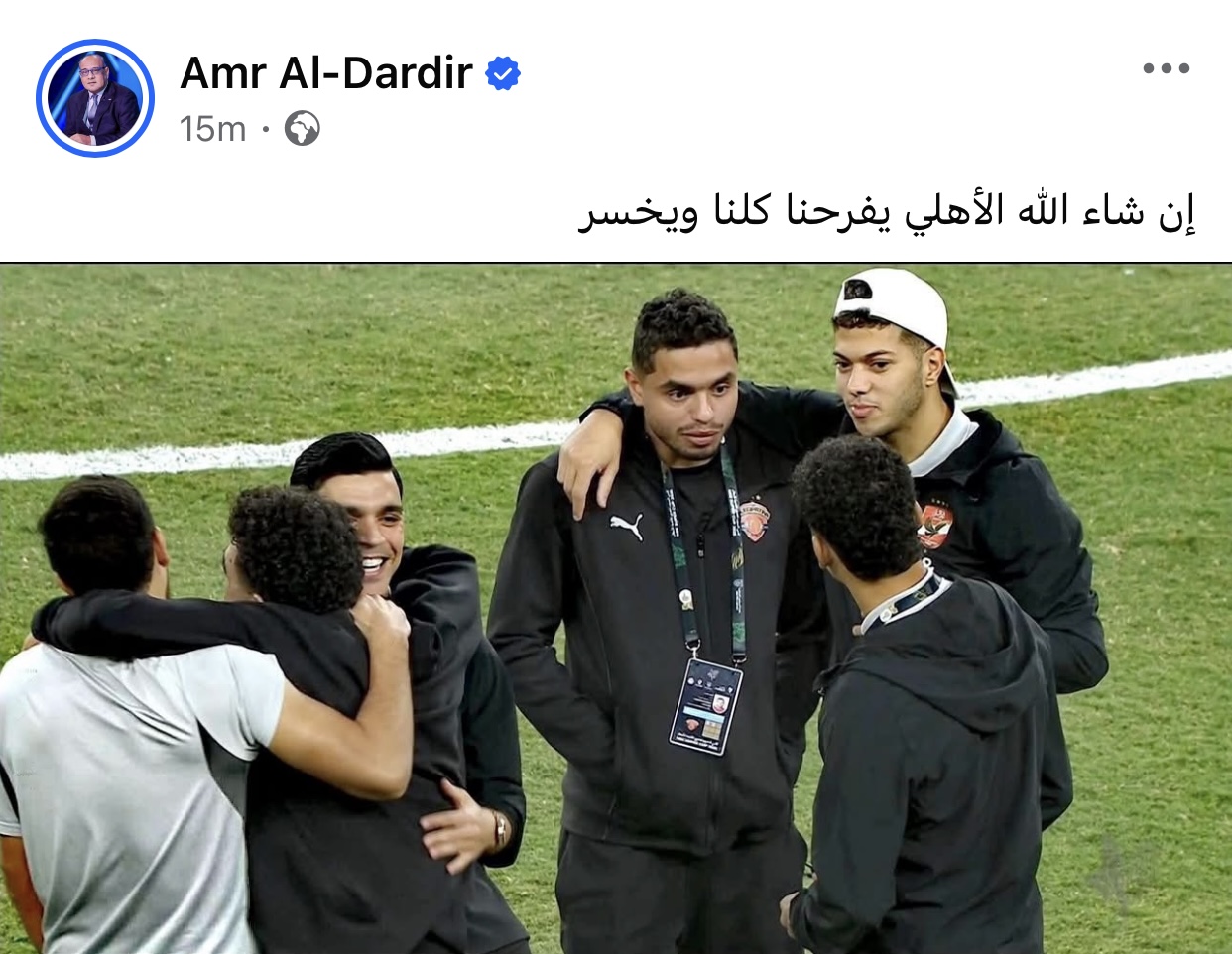 وكتب الدرديري عبر حسابه الشخصي بموقع فيسبوك: “إن شاءالله الأهلي يفرحنا كلنا ويخسر”.