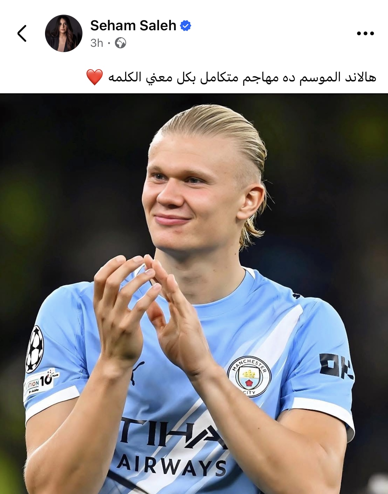 وكتبت سهام صالح عبر حسابها الشخصي بموقع فيسبوك: "هالاند الموسم دة مهاجم متكامل بكل معنى الكلمة".