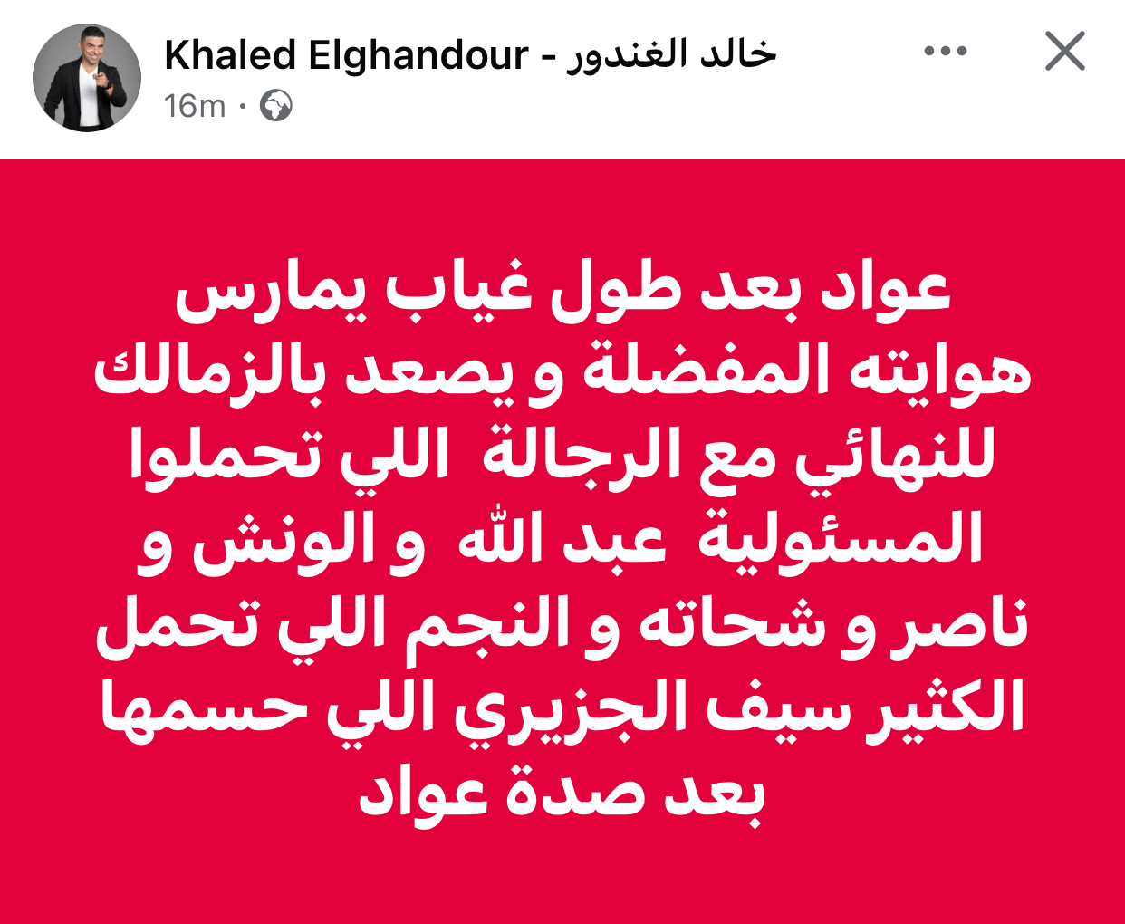 وكتب الغندور عبر حسابه على موقع التواصل الاجتماعي فيسبوك: “عواد بعد طول غياب يمارس هوايته المفضلة ويصعد بالزمالك للنهائي مع الرجالة اللي تحملوا المسئولية، عبد الله، والونش، وناصر، وشحاتة، والنجم اللي تحمل الكثير سيف الجزيري اللي حسمها بعد صدة عواد".