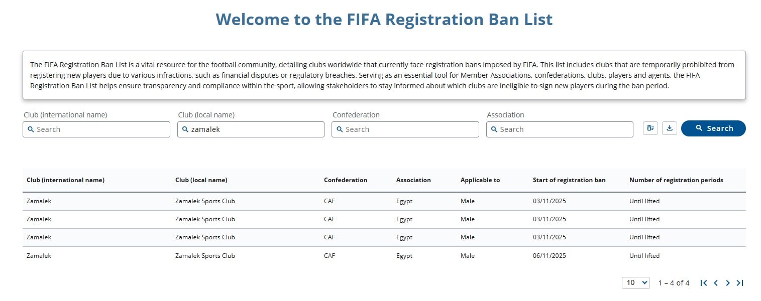 وسبق وأعلن "فيفا" عن إيقاف القيد للزمالك في 3 قضايا بسبب مستحقات مساعدي البرتغالي جوزيه جوميز المدير الفني الأسبق للفريق الأبيض.