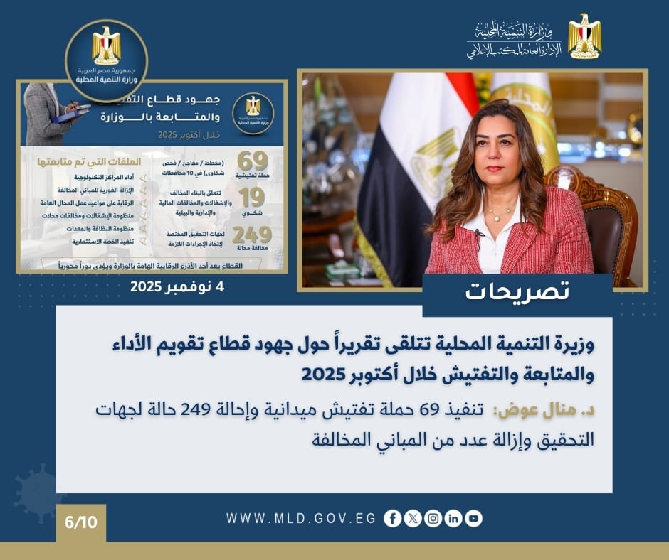 تلقت الدكتورة منال عوض وزيرة التنمية المحلية والقائم بأعمال وزير البيئة، تقريراً من قطاع تقويم الأداء والمتابعة والتفتيش بالوزارة برئاسة المهندس هيثم الدسوقي ، حول أبرز مجهودات القطاع خلال شهر أكتوبر 2025 في متابعة الأداء الميداني للوحدات المحلية بالمحافظات، وضبط منظومة العمل وتحسين الخدمات المقدمة للمواطنين، حيث تم تنفيذ 69 حملة تفتيش ميدانية في 10 محافظات وإحالة 249 حالة لجهات التحقيق وإزالة عدد من المباني المخالفة .