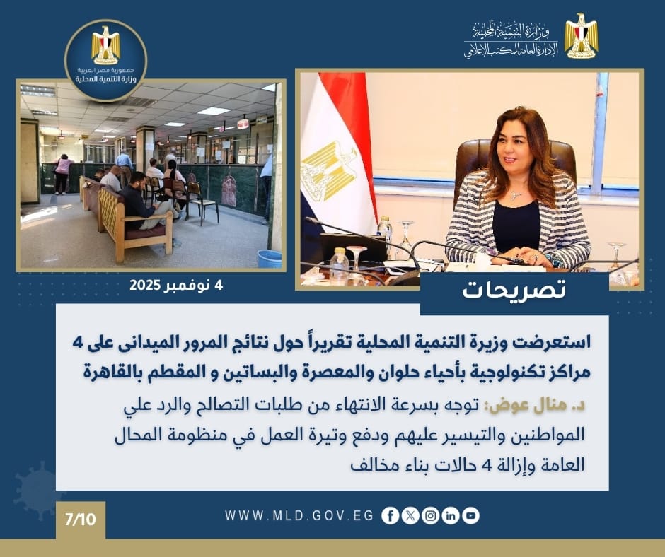 تلقت الدكتورة منال عوض، وزيرة التنمية المحلية والقائم بأعمال وزيرة البيئة، تقريرًا من قطاع التفتيش والمتابعة بالوزارة برئاسة المهندس هيثم الدسوقي، حول نتائج الحملة المفاجئة التي نفذها القطاع على حي جنوب الجيزة بمحافظة الجيزة، لمتابعة سير العمل ومستوى الخدمات المقدمة للمواطنين، مع التشديد على تنفيذ حملات النظافة ورفع الاشغالات على مدار الساعة فى ضوء افتتاح المتحف المصري الكبير للظهور بالمظهر اللائق والمشرف أمام العالم أجمع .