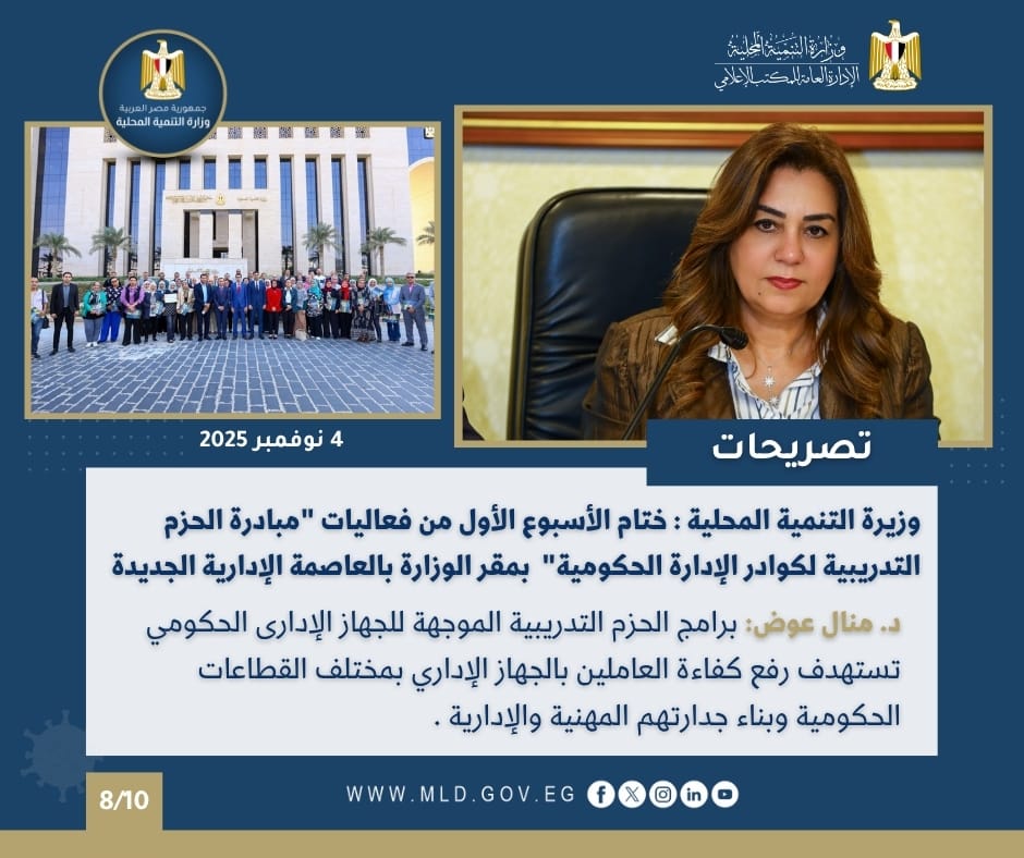 كما أعلنت الدكتورة منال عوض، وزيرة التنمية المحلية ، عن إنطلاق فعاليات الأسبوع التدريبي الثالث عشر من الخطة التدريبية السنوية لمركز التنمية المحلية بسقارة للعام 2025 / 2026، والمقرره  خلال الفترة من 2 حتى 5 نوفمبر 2025، بتنفيذ 5 برامج تدريبية يستفيد منها 450 متدربًا من مختلف المحافظات، ضمن جهود الوزارة لبناء قدرات العاملين بالإدارة المحلية ورفع كفاءة الأداء في مختلف القطاعات الخدمية والتنموية.