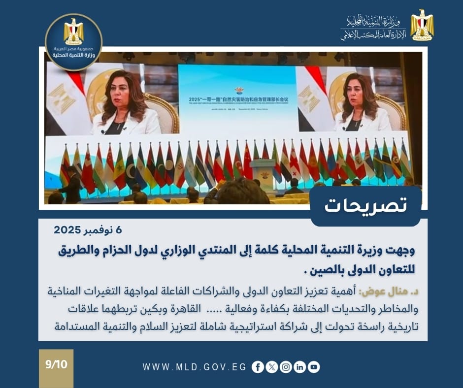 أكدت الدكتورة منال عوض وزيرة التنمية المحلية والقائم بأعمال وزير البيئة ، على أهمية تعزيز التعاون الدولى والشراكات الفاعلة والإرادة السياسية المشتركة لمواجهة التغيرات المناخية والكوارث الطبيعية والمخاطر والتحديات المختلفة بفعالية وكفاءة ، جاء ذلك فى الكلمة التى وجهتها وزيرة التنمية المحلية إلى الجلسة الوزارية للمنتدي الوزاري لدول الحزام والطريق للتعاون الدولى فى الحد من مخاطر الكوارث وإدارة الطوارئ لعام 2025 والمنعقد خلال الفترة من 5-7 نوفمبر الجاري فى جمهورية الصين بحضور وانج شيانج شي وزير إدارة الطوارئ الصيني وعدد من الوزراء والمسؤولين من مختلف دول العالم .