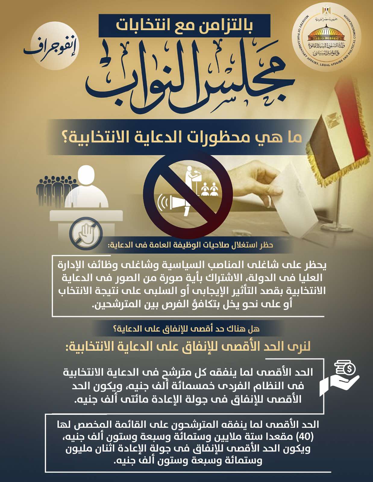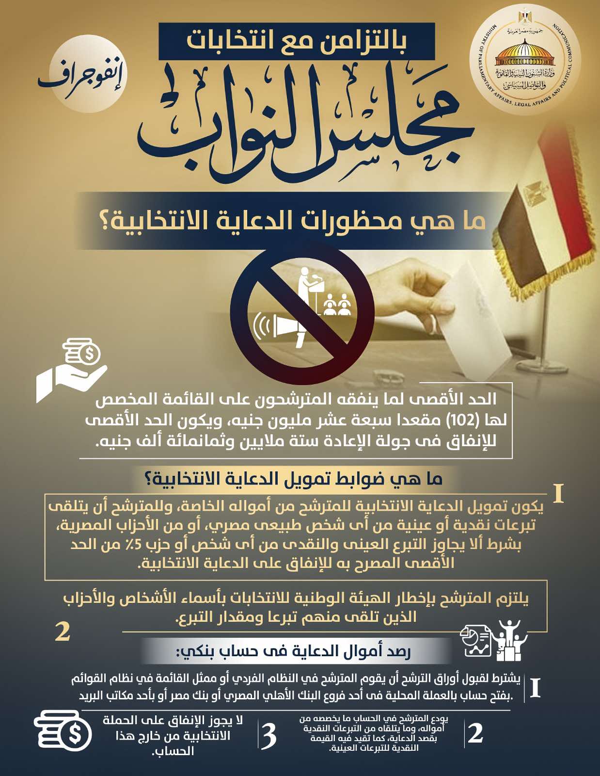 وفي حلقة اليوم تجيب وزارة الشؤون النيابية والقانونية والتواصل السياسي عن كل الأسئلة التي تتعلق بالدعاية الانتخابية،، ومحظوراتها، وحدود الإنفاق، والصمت الدعائي، في شكل إنفوجراف، حتى تكون عملية الاطلاع سهلة ومختصرة أمام المواطن.