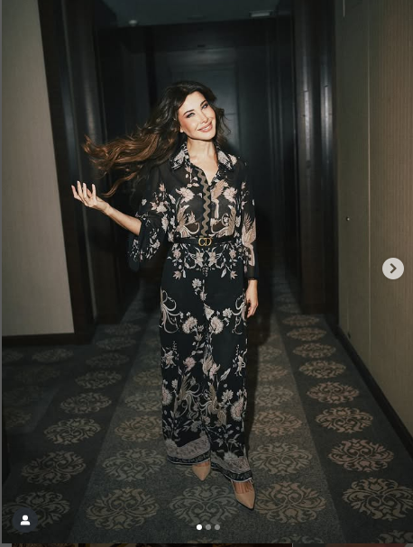 تألقت نانسي عجرم في الصور بإطلالة راقية، حيث ارتدت بنطلون وبلوزة باللون الأسود المزين بالنقوشات ذات اللون البيج.