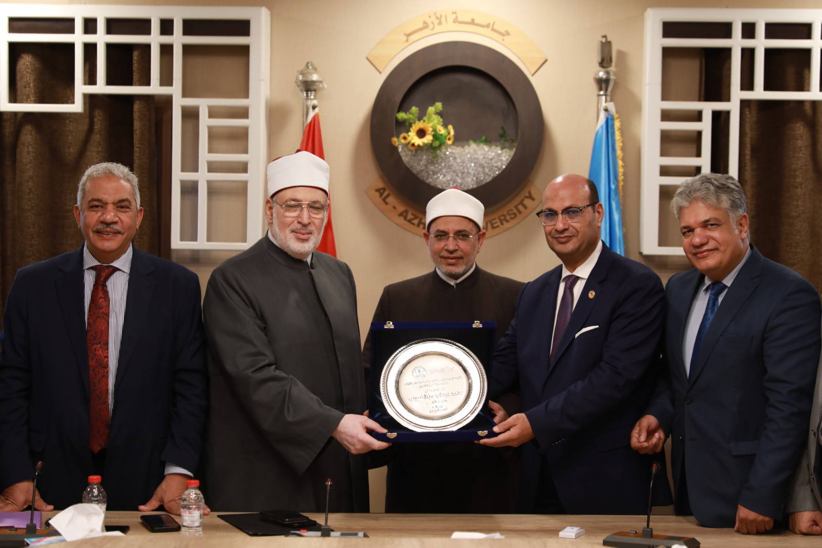 وفي ختام المؤتمر قام الدكتور سامح جبر، رئيس المؤتمر، والدكتور ياسر عامر، سكرتير عام المؤتمر، والدكتور محمد عرفات، رئيس اللجنة العلمية بإهداء درع المؤتمر لقيادات الأزهر الشريف جامعًا وجامعة.