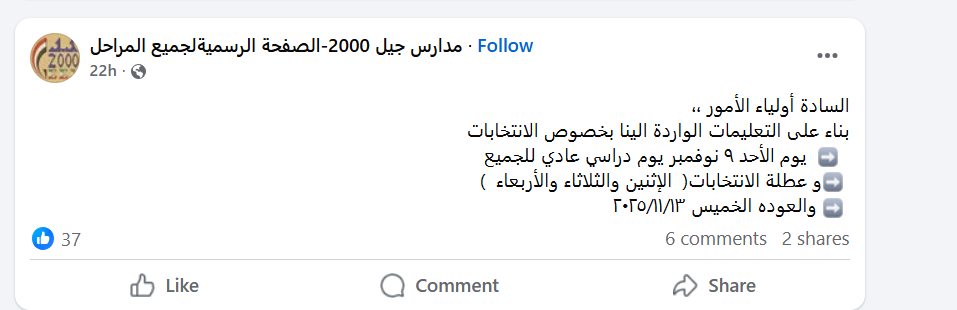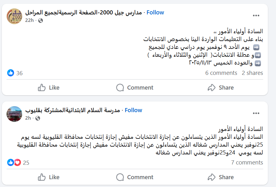 بينما أعلنت الصفحة الرسمية لمدرسة جيل 2000 بالسادس من أكتوبر أنه بناءً على التعليمات الواردة بخصوص الانتخابات، فسيكون يوم الأحد 9 نوفمبر يوما دراسيا عاديا للجميع، وستكون عطلة الانتخاباتالاثنين والثلاثاء والأربعاء، على أن تتم العودة للدراسة الخميس 13/11/2025.