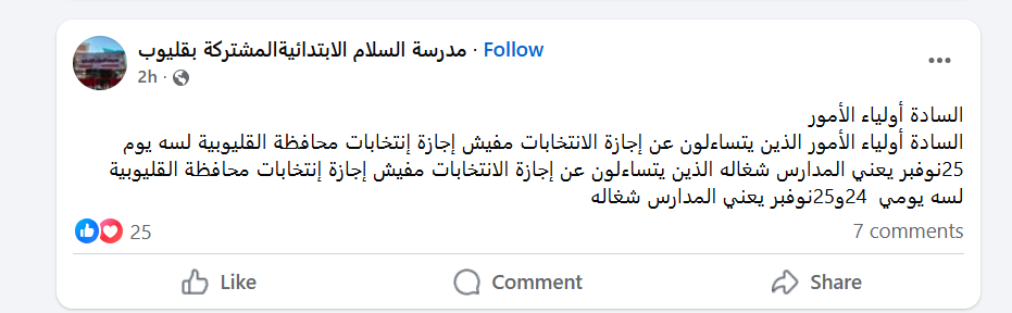 وقالت مدرسة السلام الابتدائية المشتركة: “السادة أولياء الأمور الذين يتساءلون عن إجازة الانتخابات، مفيش إجازة انتخابات، محافظة القليوبية لسه يوم 25 نوفمبر، يعني المدارس شغالة”.