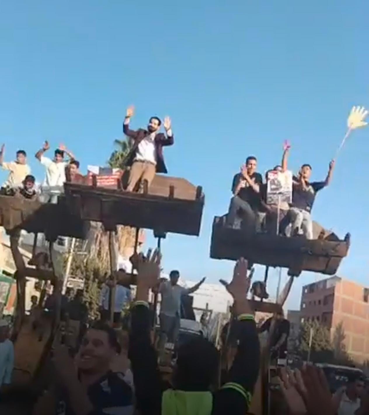 وظهر المرشح محمولا علي اللوادر وطاف شوارع القرية لتعريف الأهالي به.