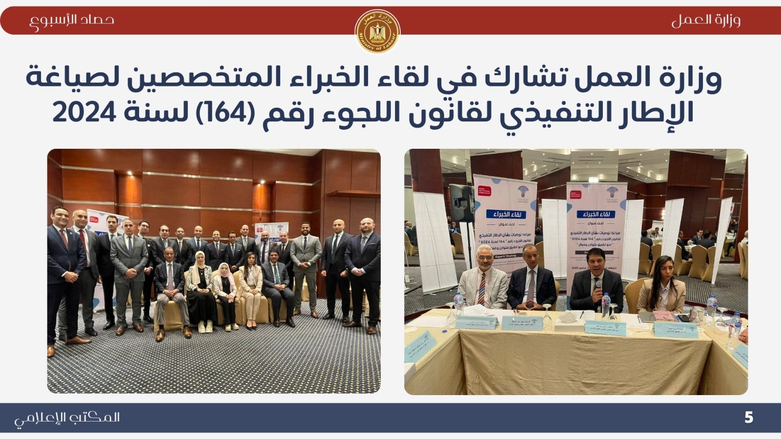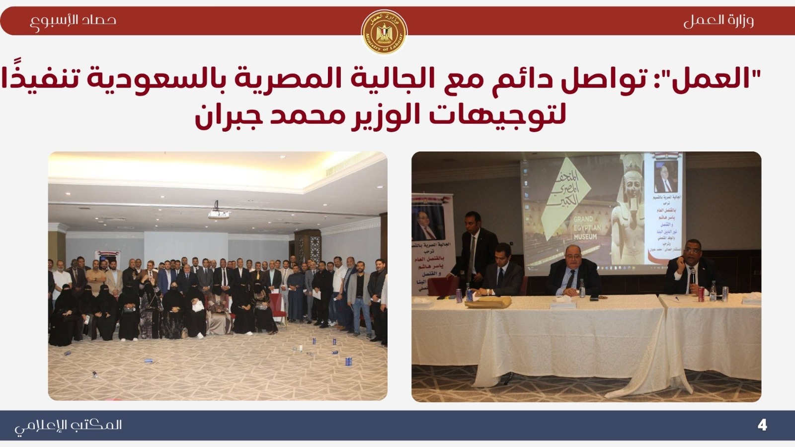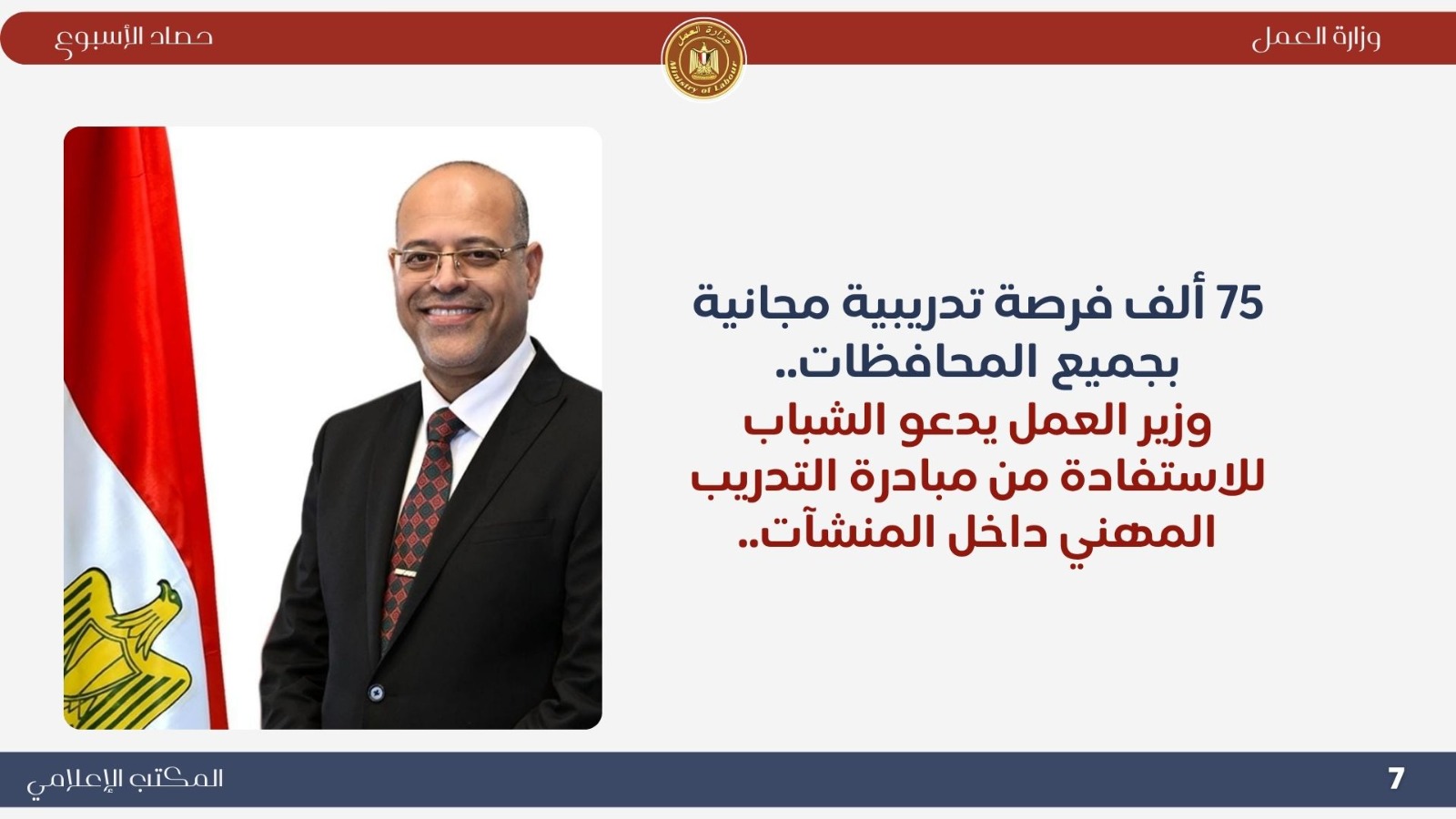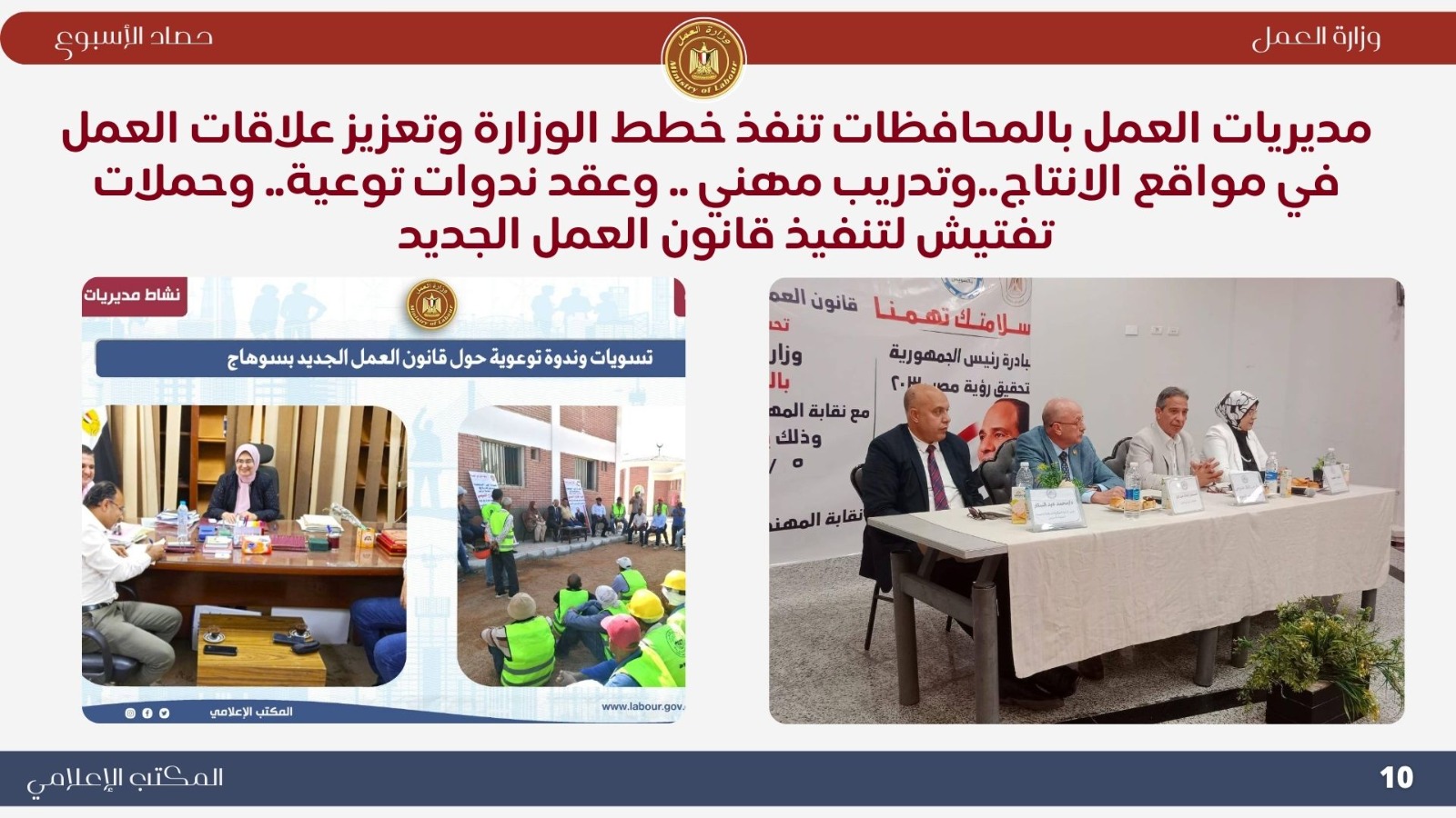 ..بهذه الجهود المتكاملة، واصلت وزارة العمل خلال الأسبوع تنفيذ رؤية الدولة لبناء سوق عمل منظم، آمن، وعادل، قائم على الشراكة بين الحكومة والقطاع الخاص والمجتمع المدني، بما يعزز التنمية المستدامة وينشر ثقافة السلامة والصحة المهنية في مواقع العمل ،ويصون كرامة الإنسان العامل في الجمهورية الجديدة.
