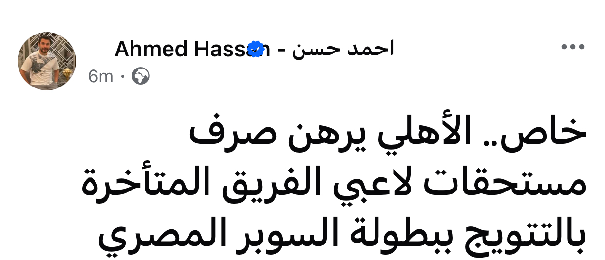 وكتب أحمد حسن عبر حسابه الرسمي على موقع التواصل الاجتماعي فيسبوك: “خاص.. الأهلي يرهن صرف مستحقات لاعبي الفريق المتأخرة بالتتويج ببطولة السوبر المصري".