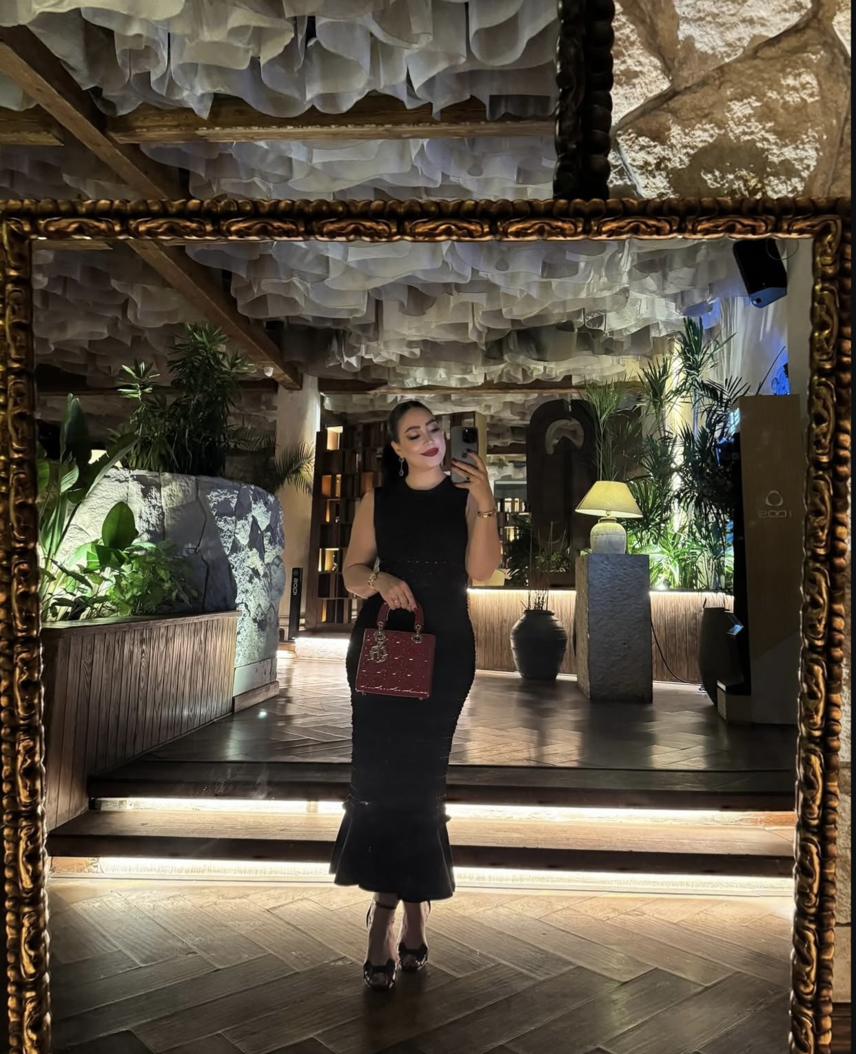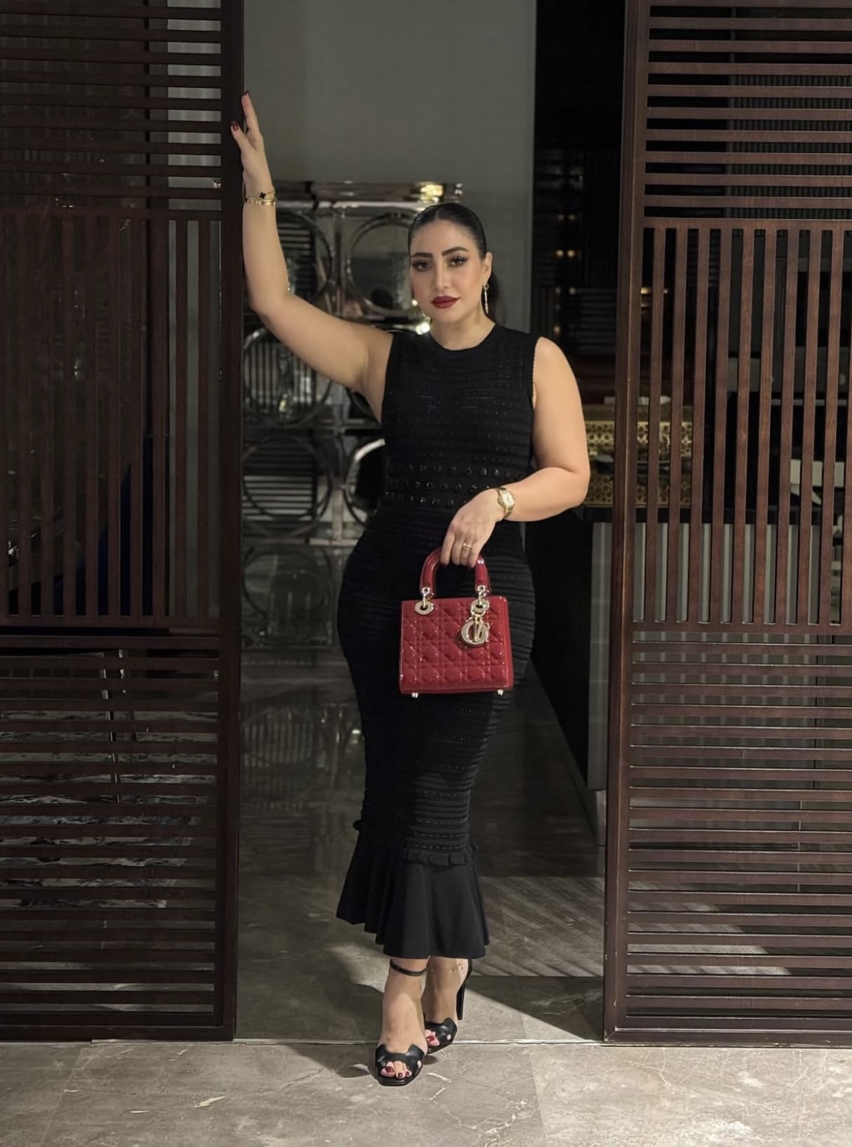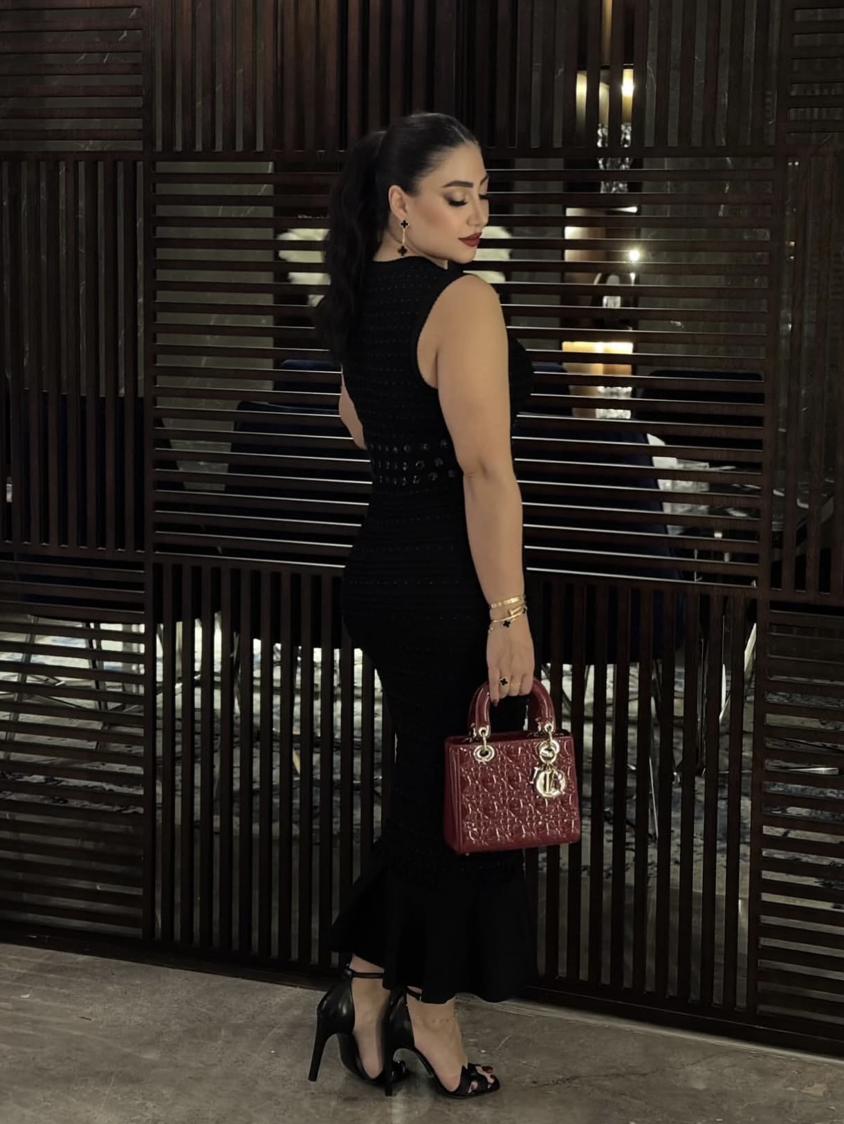 ونسّقت بوسي، الإطلالة، مع حقيبة باللون النبيتي، وحذاء كلاسيكيا بنفس لون الفستان، كما اختارت إكسسوارات ذهبية ناعمة وساعة أنيقة أضافت لمسة راقية على مظهرها.