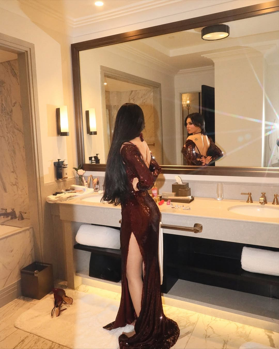 كما اختارت ، أن تترك بشرتها على طبيعيتها و وضعت بعض مساحيق المكياج بالالوان الهادئة وقامت بترك شعرها الطويل منسدلا بين كتفيها بطريقة الكيرلي الجذابة التي تتناسب مع ظهورها.